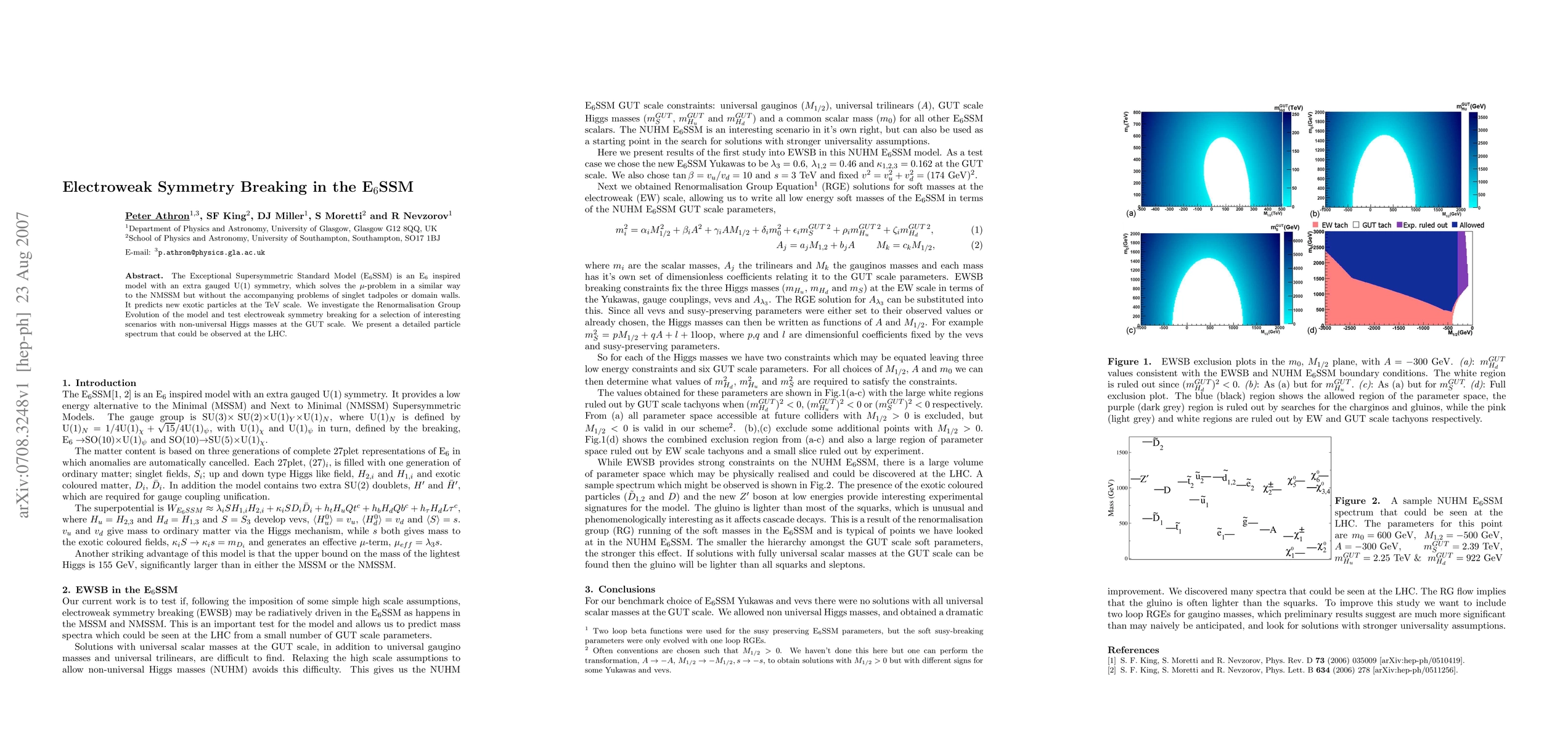 The Exceptional Supersymmetric Standard Model (E6SSM) is an E6 inspired model with an extra gauged U(1) symmetry, which solves the mu-problem in a similar way to the NMSSM but without the accompanying problems of singlet tadpoles or domain walls. It predicts new exotic particles at the TeV scale. We investigate the Renormalisation Group Evolution of the model and test electroweak symmetry breaking for a selection of interesting scenarios with non-universal Higgs masses at the GUT scale. We present a detailed particle spectrum that could be observed at the LHC.