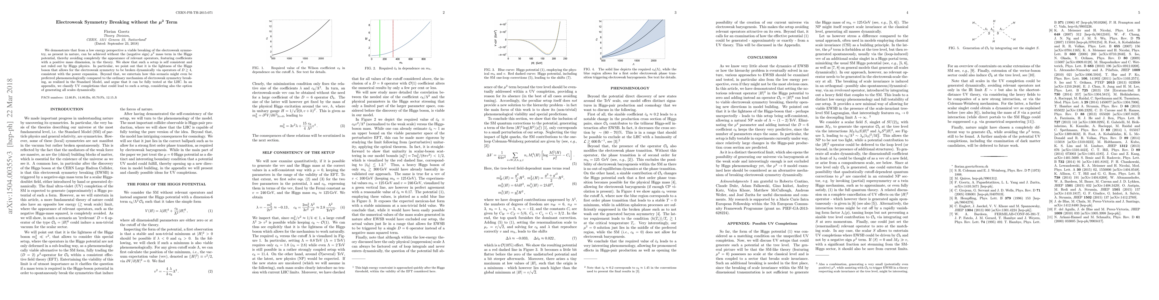 This paper proposes a viable mechanism for electroweak symmetry breaking without relying on the conventional $\mu^2$ term in the Higgs potential, suggesting that the lightness of the Higgs allows for dynamic breaking via higher-dimensional operators. It argues that this setup could be phenomenologically preferred and fully testable at the LHC.