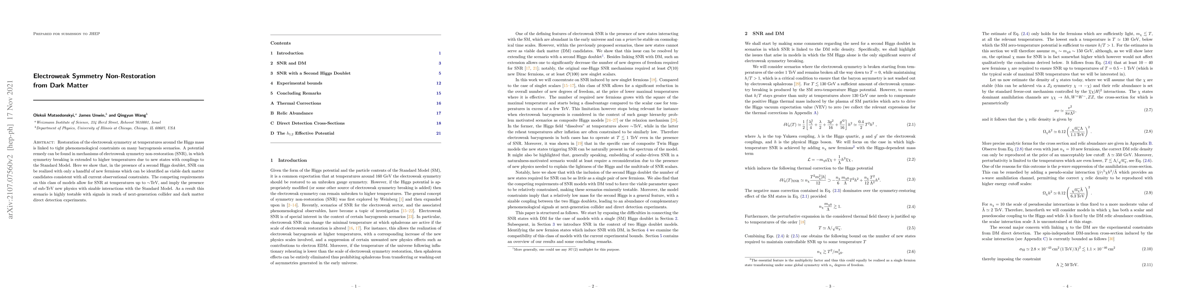 Restoration of the electroweak symmetry at temperatures around the Higgs mass is linked to tight phenomenological constraints on many baryogenesis scenarios. A potential remedy can be found in mechanisms of electroweak symmetry non-restoration (SNR), in which symmetry breaking is extended to higher temperatures due to new states with couplings to the Standard Model. Here we show that, in the presence of a second Higgs doublet, SNR can be realized with only a handful of new fermions which can be identified as viable dark matter candidates consistent with all current observational constraints. The competing requirements on this class of models allow for SNR at temperatures up to $\sim$TeV, and imply the presence of sub-TeV new physics with sizable interactions with the Standard Model. As a result this scenario is highly testable with signals in reach of next-generation collider and dark matter direct detection experiments.