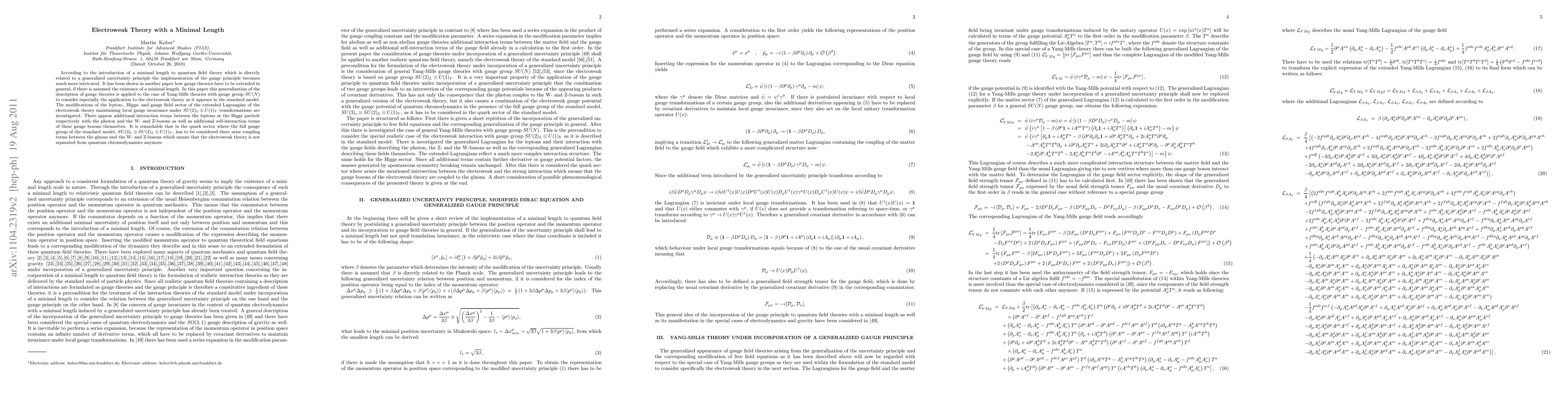 According to the introduction of a minimal length to quantum field theory which is directly related to a generalized uncertainty principle the implementation of the gauge principle becomes much more intricated. It has been shown in another paper how gauge theories have to be extended in general, if there is assumed the existence of a minimal length. In this paper this generalization of the description of gauge theories is applied to the case of Yang-Mills theories with gauge group SU(N) to consider especially the application to the electroweak theory as it appears in the standard model. The modifications of the lepton-, Higgs- and gauge field sector of the extended Lagrangian of the electroweak theory maintaining local gauge invariance under $SU(2)_L\otimes U(1)_Y$ transformations are investigated. There appear additional interaction terms between the leptons or the Higgs particle respectively with the photon and the W- and Z-bosons as well as additional self-interaction terms of these gauge bosons themselves. It is remarkable that in the quark sector where the full gauge group of the standard model, $SU(3)_c \otimes SU(2)_L\otimes U(1)_Y$, has to be considered there arise coupling terms between the gluons und the W- and Z-bosons which means that the electroweak theory is not separated from quantum chromodynamics anymore.