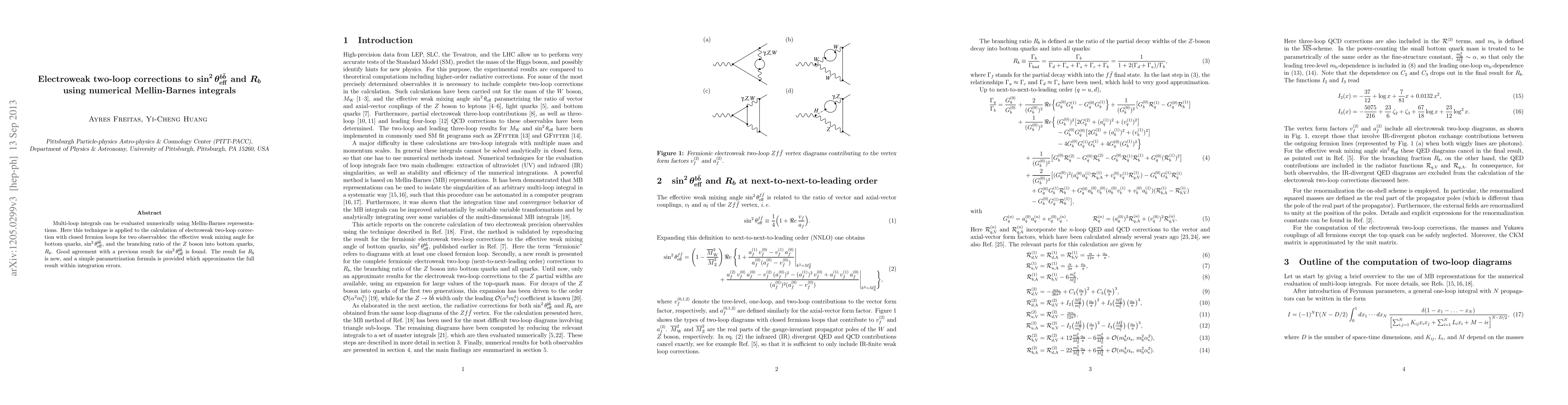 Multi-loop integrals can be evaluated numerically using Mellin-Barnes representations. Here this technique is applied to the calculation of electroweak two-loop correction with closed fermion loops for two observables: the effective weak mixing angle for bottom quarks, sin^2{\theta}(eff,bb), and the branching ratio of the Z boson into bottom quarks, R(b). Good agreement with a previous result for sin^2{\theta}(eff,bb) is found. The result for R(b) is new, and a simple parametrization formula is provided which approximates the full result within integration errors.