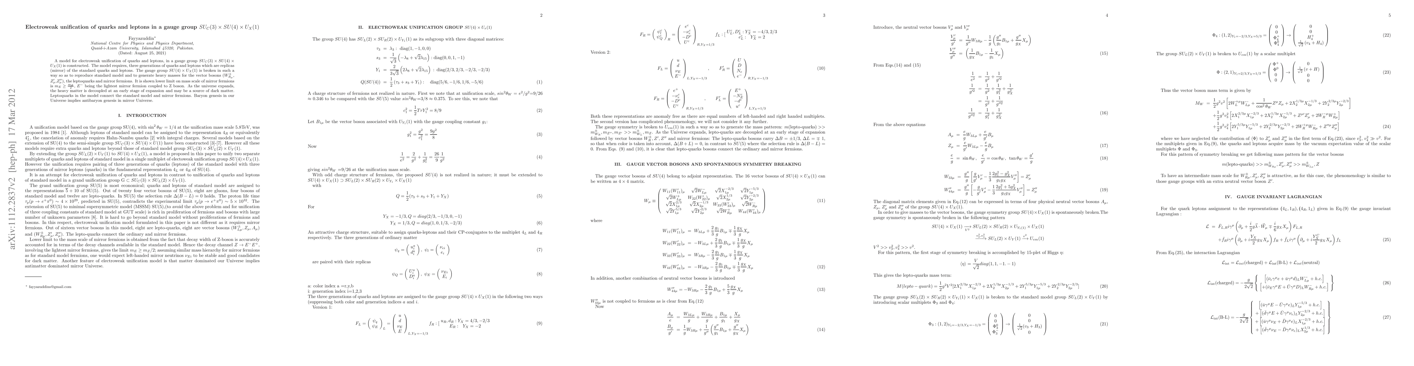 A model for electroweak unification of quarks and leptons, in a gauge group $SU_{C}(3)\times SU(4)\times U_{X}(1)$ is constructed. The model requires, three generations of quarks and leptons which are replicas (mirror) of the standard quarks and leptons. The gauge group $SU(4)\times U_{X}(1)$ is broken in such a way so as to reproduce standard model and to generate heavy masses for the vector bosons ($W^{\pm}_{R_{\mu}}$, $Z^{\prime}_{\mu}$,$Z^{\prime\prime}_{\mu}$), the leptoquarks and mirror fermions. It is shown lower limit on mass scale of mirror fermions is $m_{E}\geq\frac{m_{Z}}{2}$, $E^{-}$ being the lightest mirror fermion coupled to Z boson. As the universe expands, the heavy matter is decoupled at an early stage of expansion and may be a source of dark matter. Leptoquarks in the model connect the standard model and mirror fermions. Baryon genesis in our Universe implies antibaryon genesis in mirror Universe.