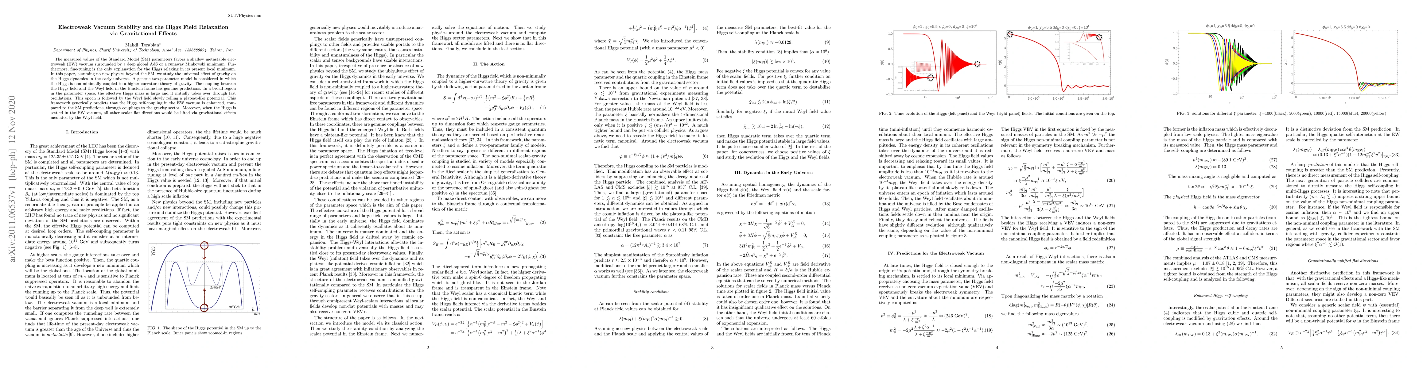 The measured values of the Standard Model (SM) parameters favors a shallow metastable electroweak (EW) vacuum surrounded by a deep global AdS or a runaway Minkowski minimum. Furthermore, fine-tuning is the only explanation for the Higgs relaxing in its present local minimum. In this paper, assuming no new physics beyond the SM, we study the universal effect of gravity on the Higgs dynamics in the early universe. A generic two-parameter model is considered in which the Higgs is non-minimally coupled to a higher-curvature theory of gravity. The coupling between the Higgs field and the Weyl field in the Einstein frame has genuine predictions. In a broad region in the parameter space, the effective Higgs mass is large and it initially takes over through fast oscillations. This epoch is followed by the Weyl field slowly rolling a plateau-like potential. This framework generically predicts that the Higgs self-coupling in the EW vacuum is enhanced, compared to the SM predictions, through couplings to the gravity sector. Moreover, when the Higgs is settled in the EW vacuum, all other scalar flat directions would be lifted via gravitational effects mediated by the Weyl field.