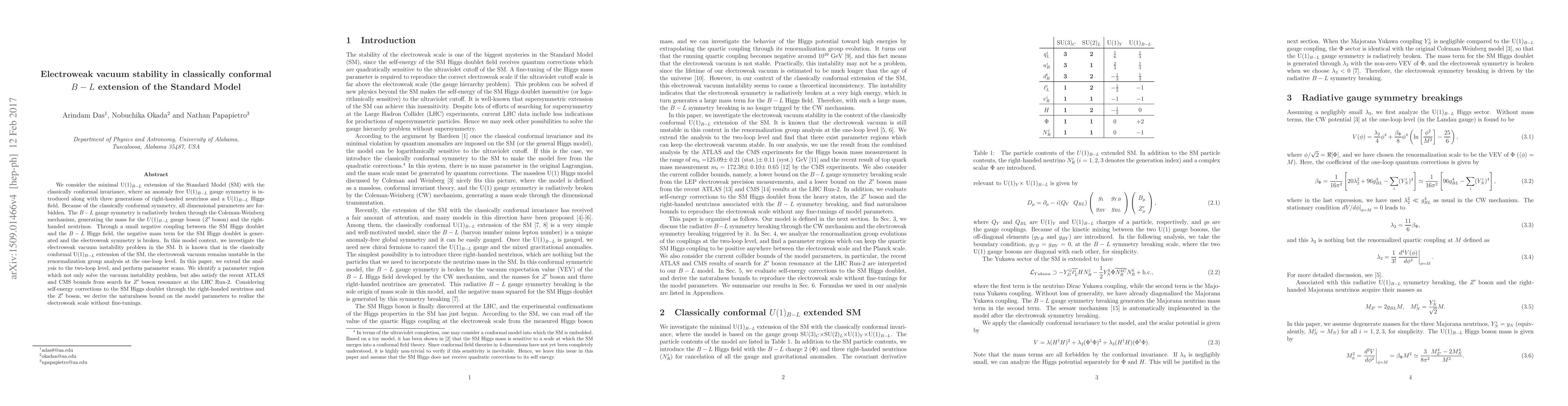 We consider the minimal U(1)$_{B-L}$ extension of the Standard Model (SM) with the classically conformal invariance, where an anomaly free U(1)$_{B-L}$ gauge symmetry is introduced along with three generations of right-handed neutrinos and a U(1)$_{B-L}$ Higgs field. Because of the classically conformal symmetry, all dimensional parameters are forbidden. The $B-L$ gauge symmetry is radiatively broken through the Coleman-Weinberg mechanism, generating the mass for the $U(1)_{B-L}$ gauge boson ($Z^\prime$ boson) and the right-handed neutrinos. Through a small negative coupling between the SM Higgs doublet and the $B-L$ Higgs field, the negative mass term for the SM Higgs doublet is generated and the electroweak symmetry is broken. In this model context, we investigate the electroweak vacuum instability problem in the SM. It is known that in the classically conformal U(1)$_{B-L}$ extension of the SM, the electroweak vacuum remains unstable in the renormalization group analysis at the one-loop level. In this paper, we extend the analysis to the two-loop level, and perform parameter scans. We identify a parameter region which not only solve the vacuum instability problem, but also satisfy the recent ATLAS and CMS bounds from search for $Z^\prime$ boson resonance at the LHC Run-2. Considering self-energy corrections to the SM Higgs doublet through the right-handed neutrinos and the $Z^\prime$ boson, we derive the naturalness bound on the model parameters to realize the electroweak scale without fine-tunings.