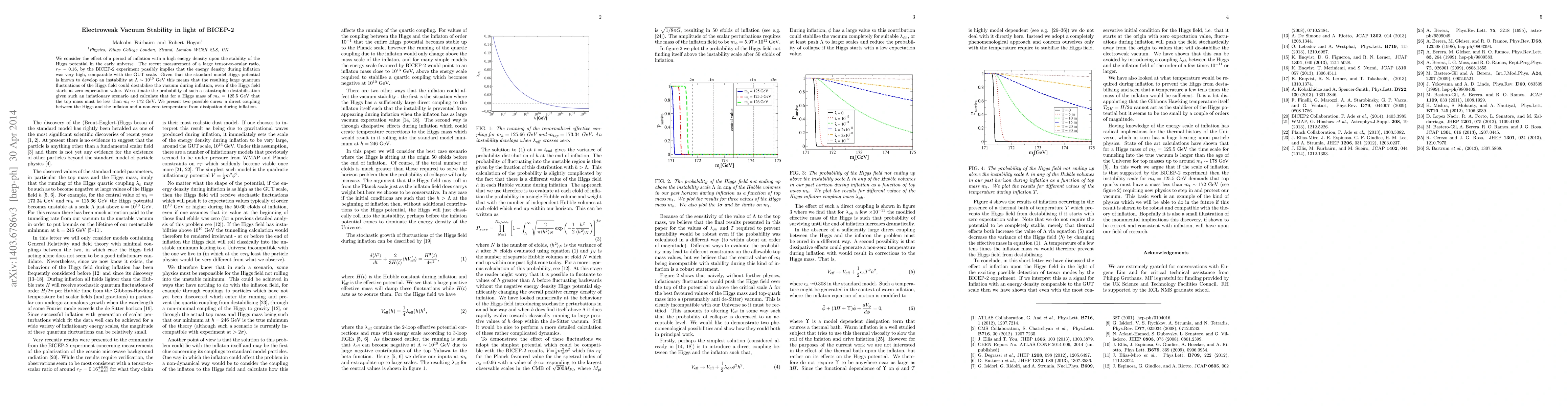 We consider the effect of a period of inflation with a high energy density upon the stability of the Higgs potential in the early universe. The recent measurement of a large tensor-to-scalar ratio, $r_T \sim 0.16$, by the BICEP-2 experiment possibly implies that the energy density during inflation was very high, comparable with the GUT scale. Given that the standard model Higgs potential is known to develop an instability at $\Lambda \sim 10^{10}$ GeV this means that the resulting large quantum fluctuations of the Higgs field could destabilize the vacuum during inflation, even if the Higgs field starts at zero expectation value. We estimate the probability of such a catastrophic destabilisation given such an inflationary scenario and calculate that for a Higgs mass of $m_h=125.5$ GeV that the top mass must be less than $m_t\sim 172$ GeV. We present two possible cures: a direct coupling between the Higgs and the inflaton and a non-zero temperature from dissipation during inflation.
