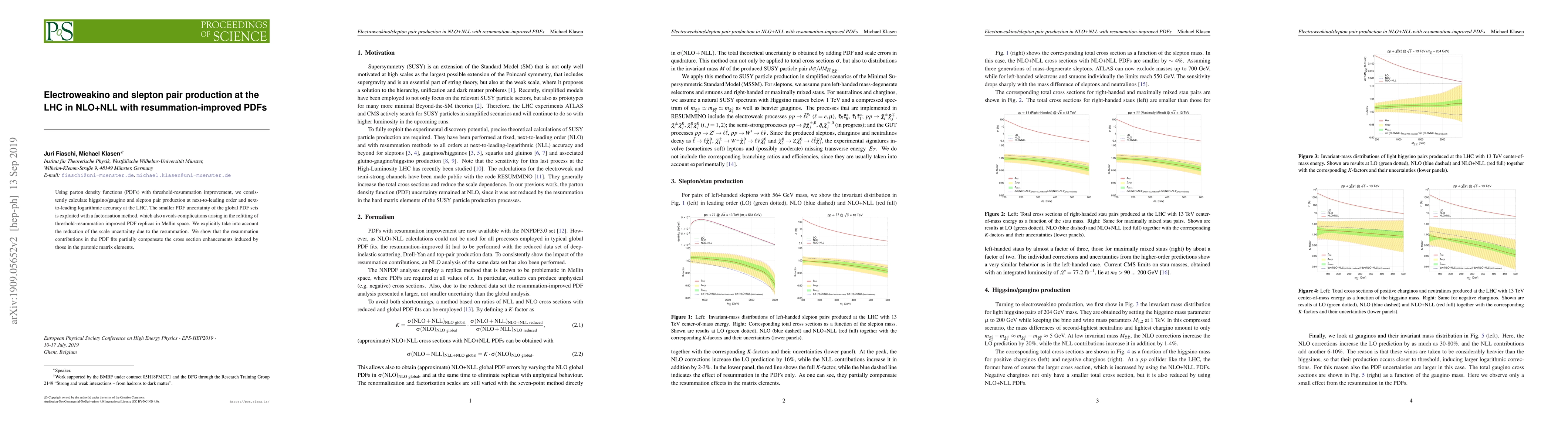 This paper presents a detailed calculation of electroweakino and slepton pair production at the LHC using next-to-leading order and next-to-leading logarithmic accuracy, with improved parton density functions that incorporate resummation. The study highlights how resummation contributions in the PDF fits partially offset the cross section enhancements from resummation in the matrix elements.