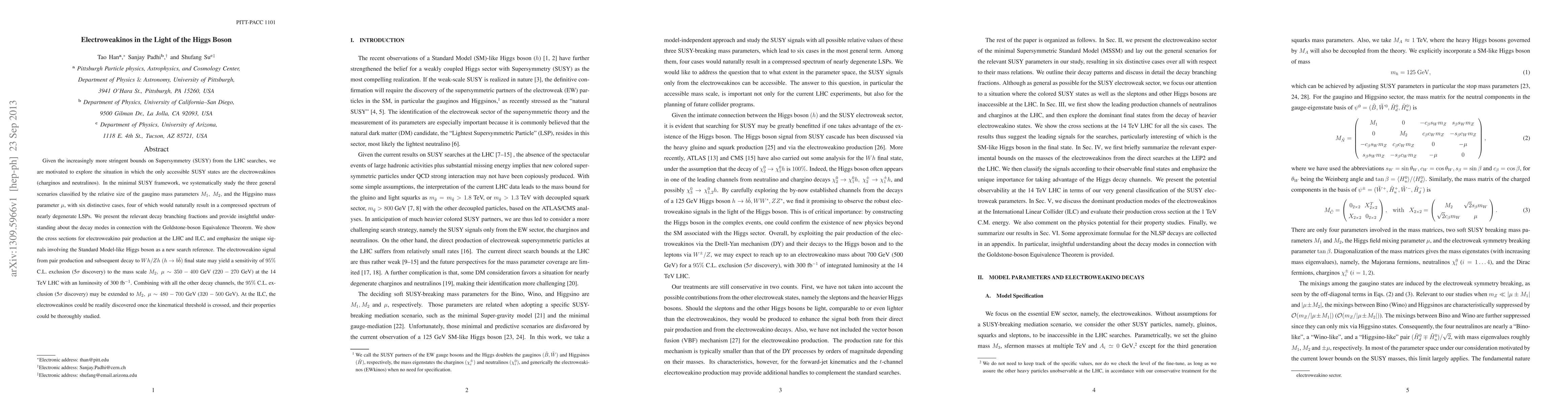 Given the increasingly more stringent bounds on Supersymmetry (SUSY) from the LHC searches, we are motivated to explore the situation in which the only accessible SUSY states are the electroweakinos (charginos and neutralinos). In the minimal SUSY framework, we systematically study the three general scenarios classified by the relative size of the gaugino mass parameters M_1, M_2 and the Higgsino mass parameter \mu, with six distinctive cases, four of which would naturally result in a compressed spectrum of nearly degenerate LSPs. We present the relevant decay branching fractions and provide insightful understanding about the decay modes in connection with the Goldstone-boson Equivalence Theorem. We show the cross sections for electroweakino pair production at the LHC and ILC, and emphasize the unique signals involving the Standard Model-like Higgs boson as a new search reference. The electroweakino signal from pair production and subsequent decay to Wh/Zh (h to b\bar{b}) final state may yield a sensitivity of 95% C.L. exclusion (5sigma discovery) to the mass scale M_2, \mu ~ 350-400 GeV (220-270 GeV) at the 14 TeV LHC with an luminosity of 300 fb^{-1}. Combining with all the other decay channels, the 95% C.L. exclusion (5sigma discovery) may be extended to M_2, \mu ~ 480-700 GeV (320-500 GeV). At the ILC, the electroweakinos could be readily discovered once the kinematical threshold is crossed, and their properties could be thoroughly studied.