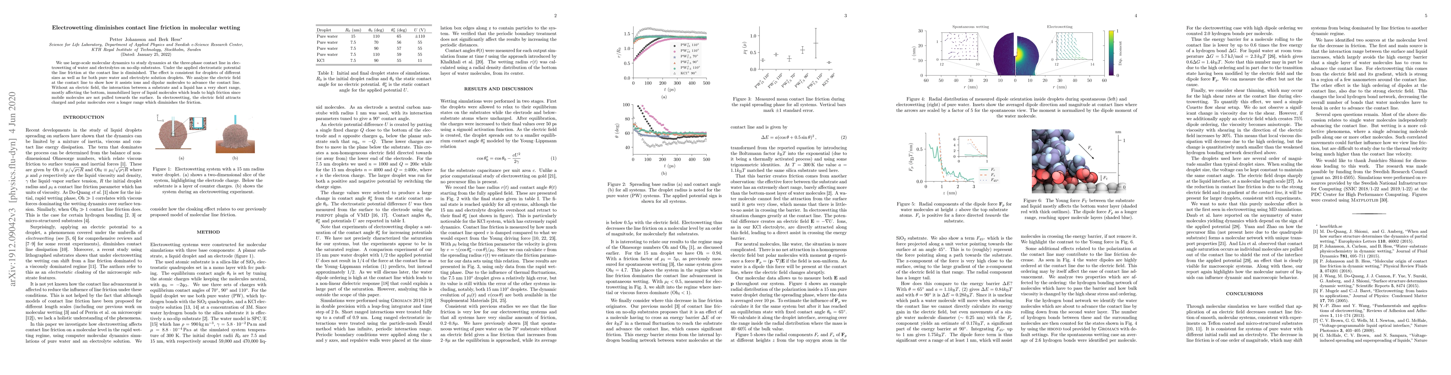Electrowetting reduces contact line friction by extending the electric field's influence over more liquid molecules, thereby diminishing friction compared to no-field conditions where only the bottom layer of liquid molecules is affected. This effect is consistent across various droplet sizes and liquid types.