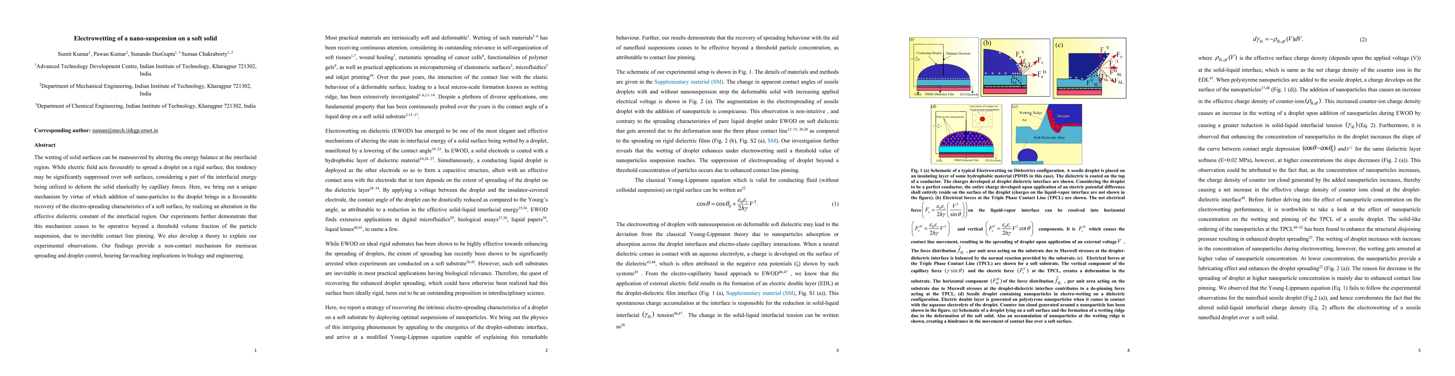 The wetting of solid surfaces can be manoeuvred by altering the energy balance at the interfacial region. While electric field acts favourably to spread a droplet on a rigid surface, this tendency may be significantly suppressed over soft surfaces, considering a part of the interfacial energy being utilized to deform the solid elastically by capillary forces. Here, we bring out a unique mechanism by virtue of which addition of nano-particles to the droplet brings in a favourable recovery of the electro-spreading characteristics of a soft surface, by realizing an alteration in the effective dielectric constant of the interfacial region. Our experiments further demonstrate that this mechanism ceases to be operative beyond a threshold volume fraction of the particle suspension, due to inevitable contact line pinning. We also develop a theory to explain our experimental observations. Our findings provide a non-contact mechanism for meniscus spreading and droplet control, bearing far-reaching implications in biology and engineering.