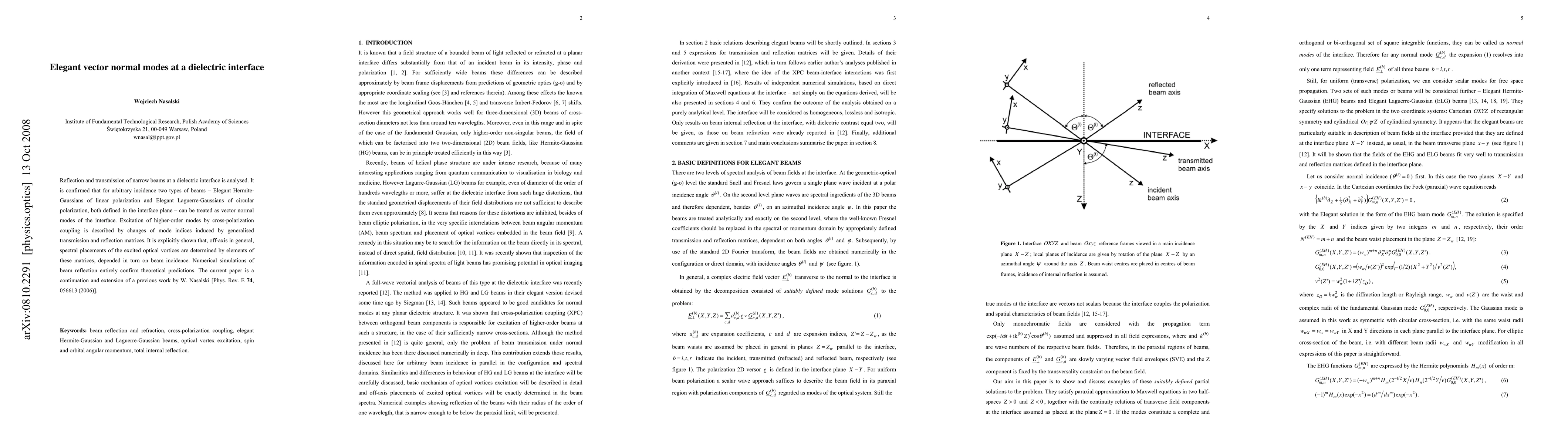 Reflection and transmission of narrow beams at a dielectric interface is analysed. It is confirmed that for arbitrary incidence two types of beams - Elegant Hermite-Gaussians of linear polarization and Elegant Laguerre-Gaussians of circular polarization, both defined in the interface plane - can be treated as vector normal modes of the interface. Excitation of higher-order modes by cross-polarization coupling is described by changes of mode indices induced by generalised transmission and reflection matrices. It is explicitly shown that, off-axis in general, spectral placements of the excited optical vortices are determined by elements of these matrices, depended in turn on beam incidence. Numerical simulations of beam reflection entirely confirm theoretical predictions. The current paper is a continuation and extension of a previous work by W. Nasalski [Phys. Rev. E 74, 056613 (2006)].