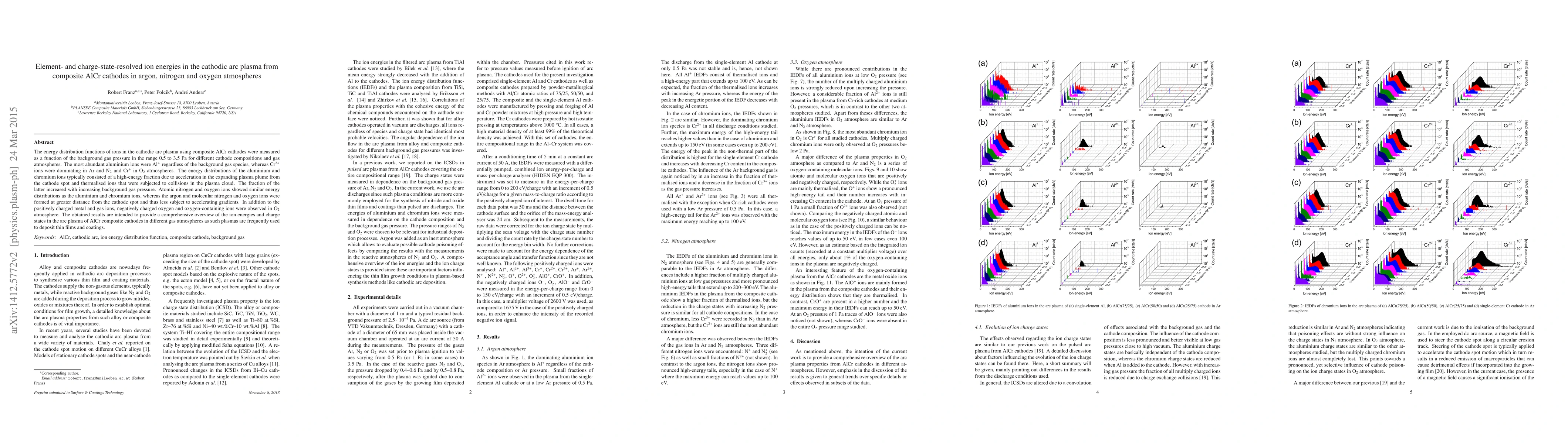 The energy distribution functions of ions in the cathodic arc plasma using composite AlCr cathodes were measured as a function of the background gas pressure in the range 0.5 to 3.5 Pa for different cathode compositions and gas atmospheres. The most abundant aluminium ions were Al$^{+}$ regardless of the background gas species, whereas Cr$^{2+}$ ions were dominating in Ar and N$_2$ and Cr$^{+}$ in O$_2$ atmospheres. The energy distributions of the aluminium and chromium ions typically consisted of a high-energy fraction due to acceleration in the expanding plasma plume from the cathode spot and thermalised ions that were subjected to collisions in the plasma cloud. The fraction of the latter increased with increasing background gas pressure. Atomic nitrogen and oxygen ions showed similar energy distributions as the aluminium and chromium ions, whereas the argon and molecular nitrogen and oxygen ions were formed at greater distance from the cathode spot and thus less subject to accelerating gradients. In addition to the positively charged metal and gas ions, negatively charged oxygen and oxygen-containing ions were observed in O$_2$ atmosphere. The obtained results are intended to provide a comprehensive overview of the ion energies and charge states in the arc plasma of AlCr composite cathodes in different gas atmospheres as such plasmas are frequently used to deposit thin films and coatings.