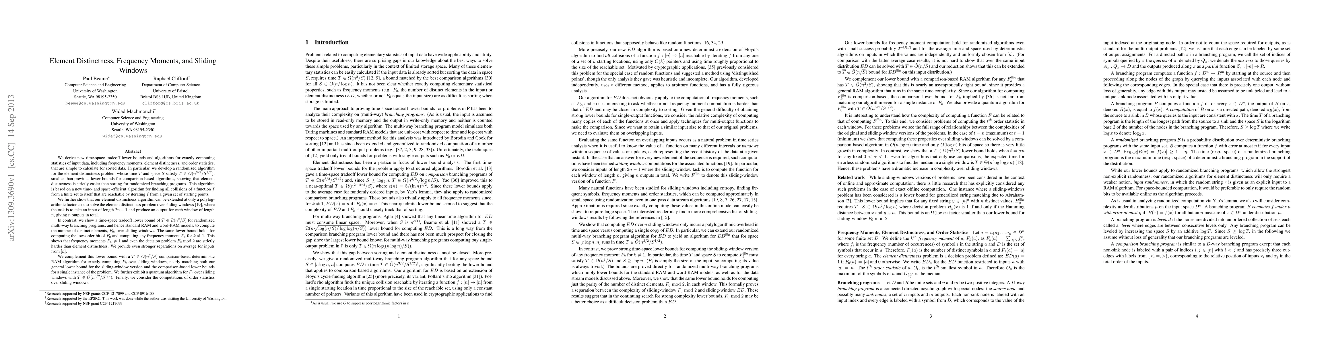 The paper derives new time-space tradeoff lower bounds and algorithms for element distinctness, frequency moments, and sliding windows using randomized and deterministic approaches, including branching programs and RAM models.