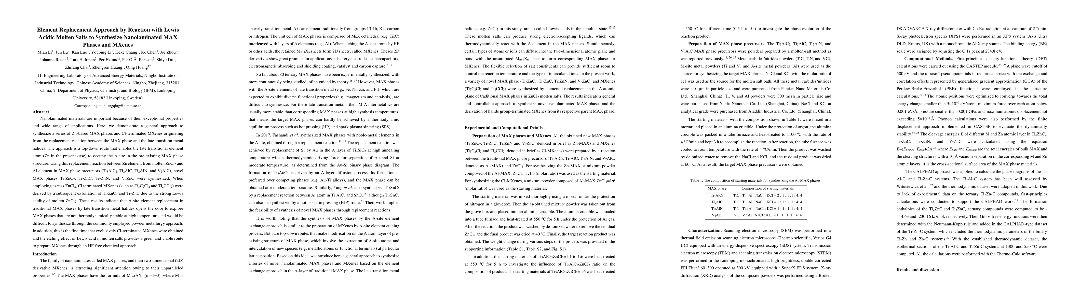 This paper presents a novel method for synthesizing Zn-based MAX phases and Cl-terminated MXenes via a reaction between MAX phase precursors and molten ZnCl2. The approach enables the replacement of Al with Zn, resulting in new MAX phases and MXenes without the need for high-temperature synthesis or HF etching.