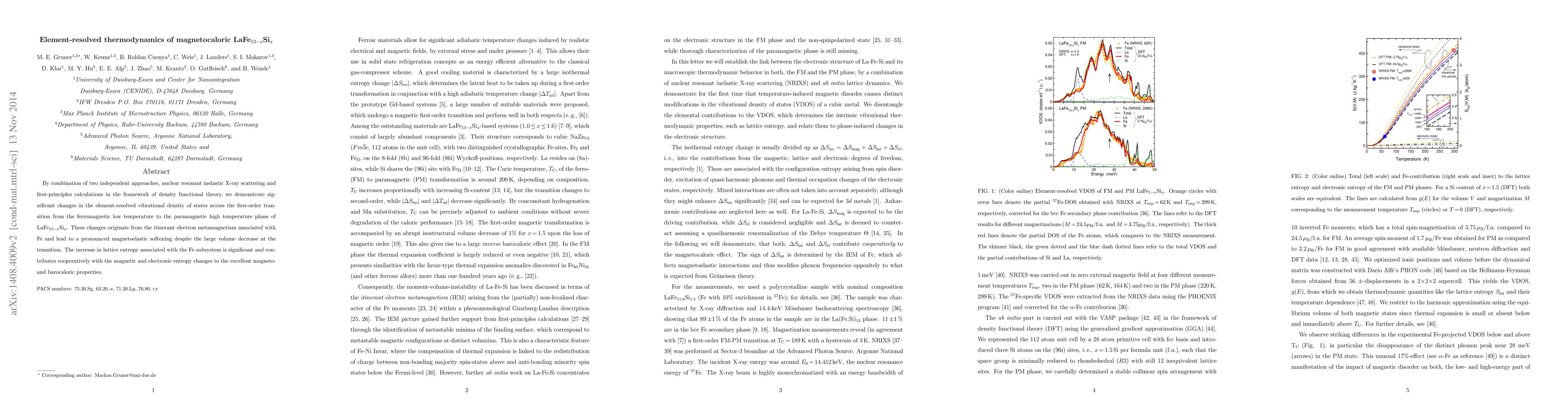 This research uses nuclear resonant inelastic X-ray scattering and first-principles calculations to analyze LaFe13-xSix. It reveals that both lattice and electronic entropy changes significantly contribute to the material's magneto- and barocaloric effect, primarily due to magneto-elastic softening from itinerant electron metamagnetism associated with Fe.