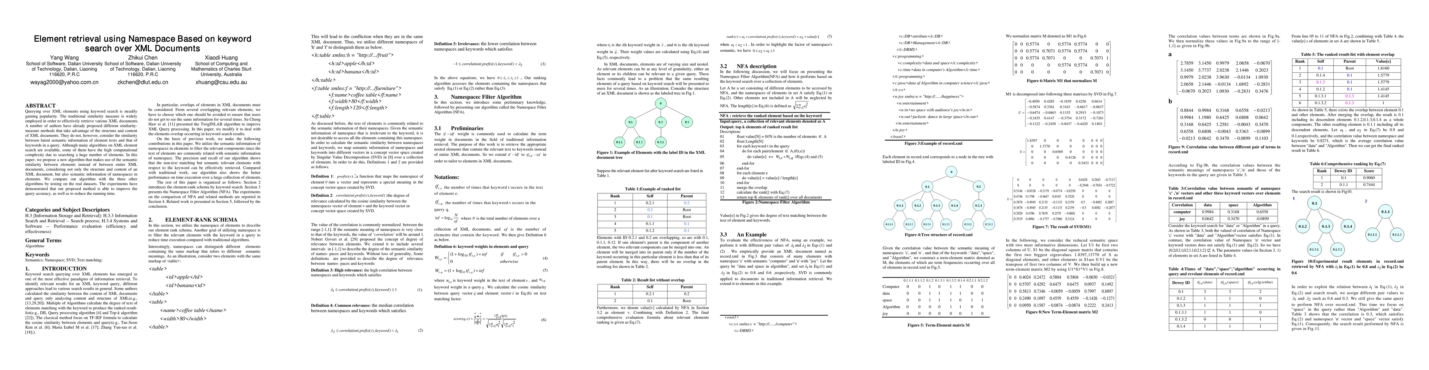 This paper proposes a new algorithm for keyword search over XML documents that leverages semantic similarity between XML elements and namespaces, improving query accuracy and reducing computational complexity compared to traditional methods. Experimental results show enhanced performance over existing algorithms.