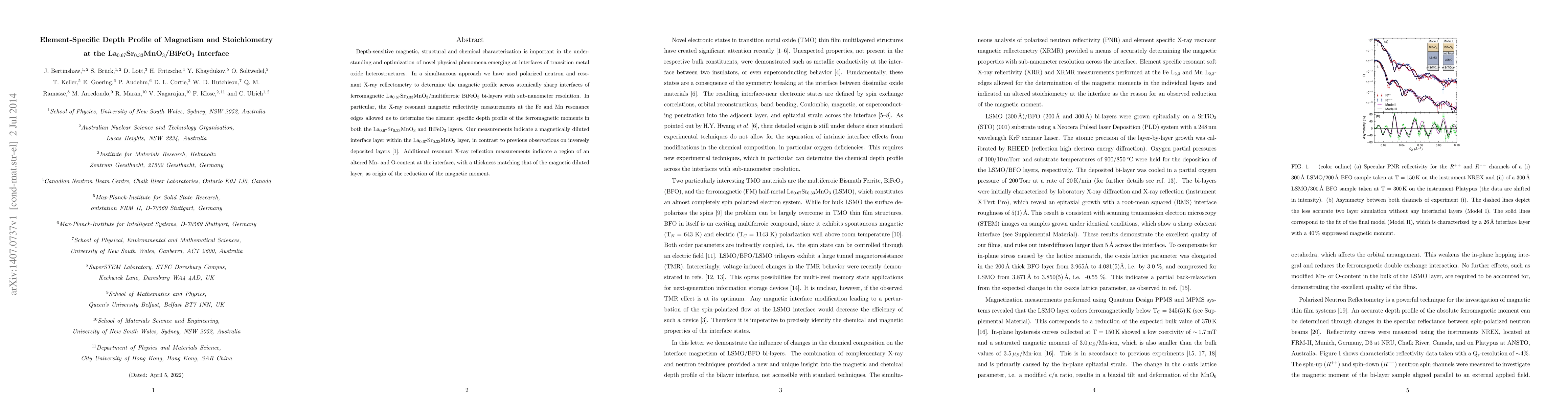 Depth-sensitive magnetic, structural and chemical characterization is important in the understanding and optimization of novel physical phenomena emerging at interfaces of transition metal oxide heterostructures. In a simultaneous approach we have used polarized neutron and resonant X-ray reflectometry to determine the magnetic profile across atomically sharp interfaces of ferromagnetic La0.67Sr0.33MnO3 / multiferroic BiFeO3 bi-layers with sub-nanometer resolution. In particular, the X-ray resonant magnetic reflectivity measurements at the Fe and Mn resonance edges allowed us to determine the element specific depth profile of the ferromagnetic moments in both the La0.67Sr0.33MnO3 and BiFeO3 layers. Our measurements indicate a magnetically diluted interface layer within the La0.67Sr0.33MnO3 layer, in contrast to previous observations on inversely deposited layers. Additional resonant X-ray reflection measurements indicate a region of an altered Mn- and O-content at the interface, with a thickness matching that of the magnetic diluted layer, as origin of the reduction of the magnetic moment.