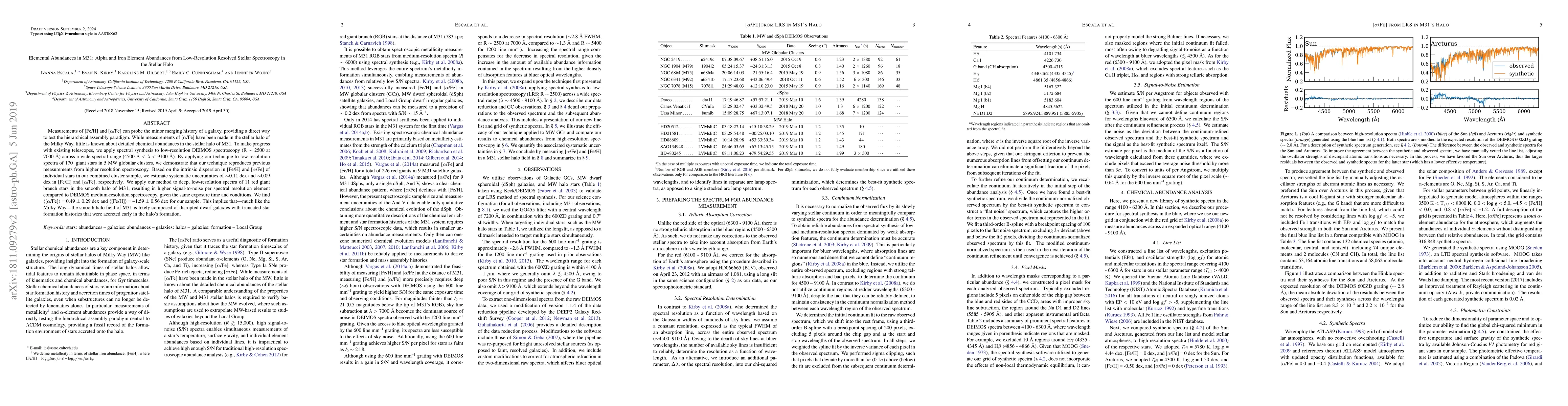 This paper investigates the elemental abundances of alpha and iron in M31's stellar halo using low-resolution spectroscopy, finding [$\alpha$/Fe] = 0.49 ± 0.29 dex and [Fe/H] = 1.59 ± 0.56 dex, suggesting M31's halo formed through early accretion of disrupted dwarf galaxies.