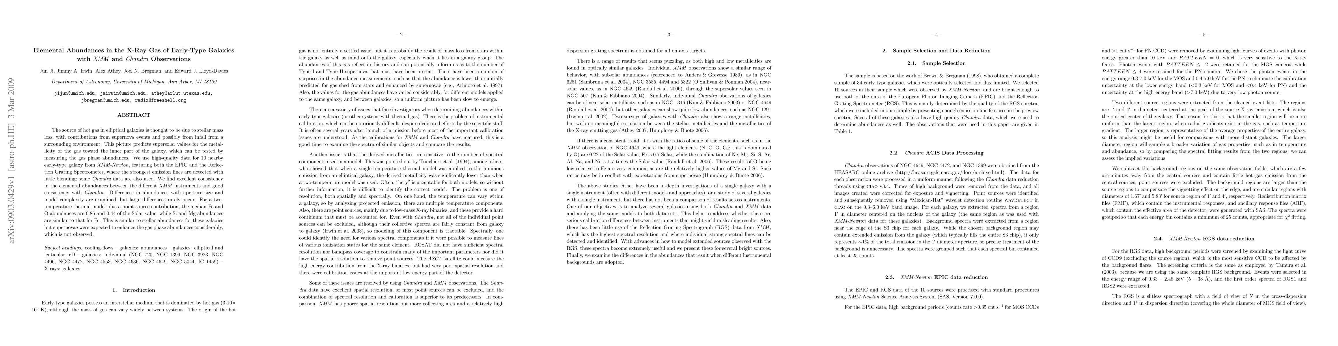 The source of hot gas in elliptical galaxies is thought to be due to stellar mass loss, with contributions from supernova events and possibly from infall from a surrounding environment. This picture predicts supersolar values for the metallicity of the gas toward the inner part of the galaxy, which can be tested by measuring the gas phase abundances. We use high-quality data for 10 nearby early-type galaxy from XMM-Newton, featuring both the EPIC and the Reflection Grating Spectrometer, where the strongest emission lines are detected with little blending; some Chandra data are also used. We find excellent consistency in the elemental abundances between the different XMM instruments and good consistency with Chandra. Differences in abundances with aperture size and model complexity are examined, but large differences rarely occur. For a two-temperature thermal model plus a point source contribution, the median Fe and O abundances are 0.86 and 0.44 of the Solar value, while Si and Mg abundances are similar to that for Fe. This is similar to stellar abundances for these galaxies but supernovae were expected to enhance the gas phase abundances considerably, which is not observed.