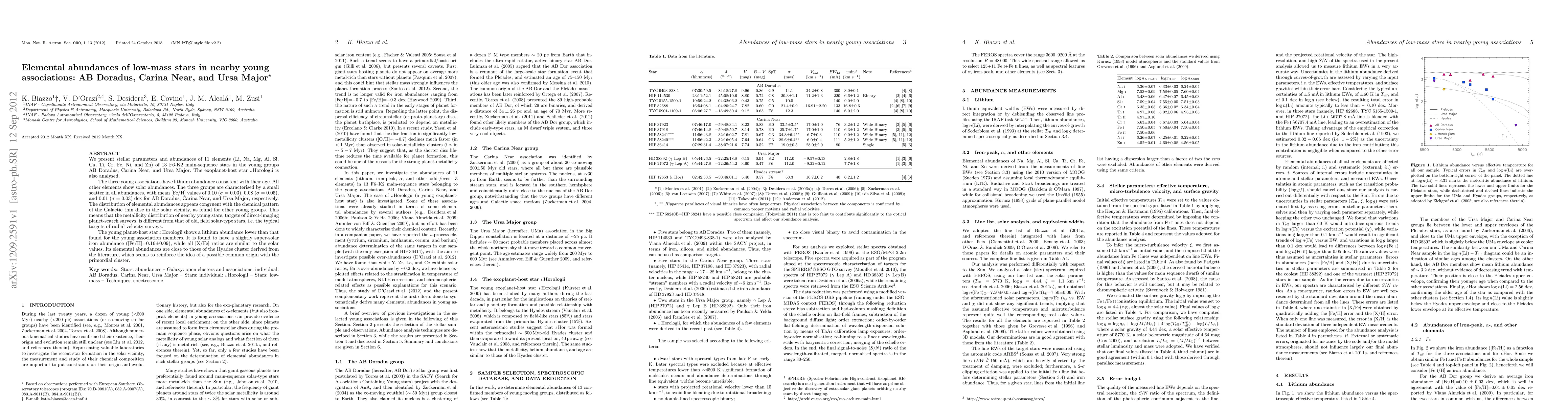 This study investigates the elemental abundances of 13 low-mass stars in three young stellar associations, finding consistent lithium abundances with their age and solar abundances for other elements. The young planet-host star \iota Horologii shows lower lithium and a slightly super-solar iron abundance, suggesting a possible common origin with the Hyades cluster.