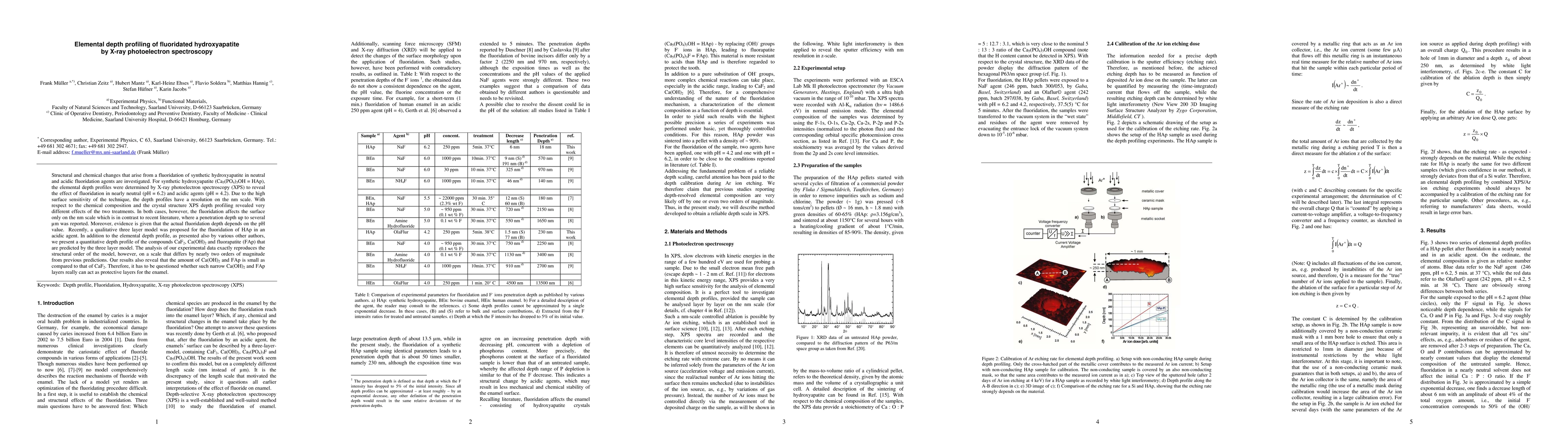The research utilized X-ray photoelectron spectroscopy (XPS) to analyze the elemental depth profiles of fluoridated hydroxyapatite (HAp) under nearly neutral (pH = 6.2) and acidic (pH = 4.2) conditions. Ar ion etching was employed for nm-scale controlled ablation, with precise depth calibration achieved through careful measurement of deposited charge on the sample and white light interferometry.