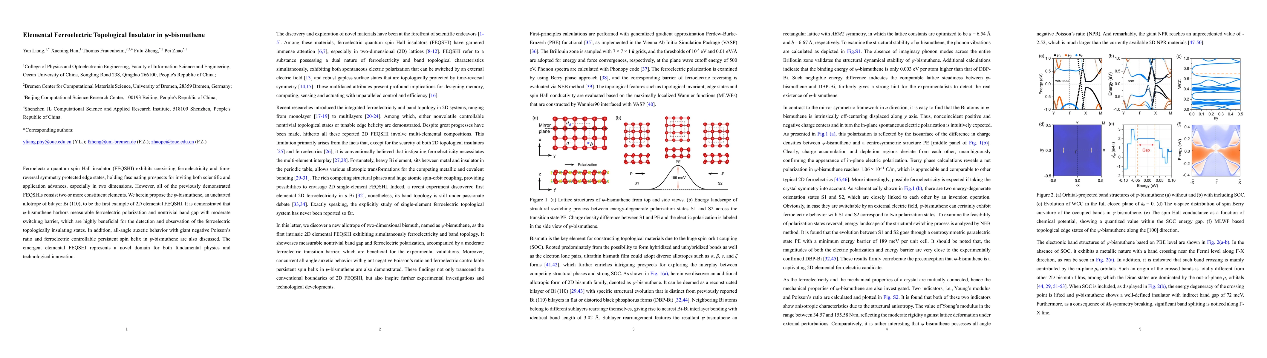 This paper proposes $\psi$-bismuthene, a novel two-dimensional elemental ferroelectric quantum spin Hall insulator, showcasing measurable ferroelectric polarization and a nontrivial band gap, thus opening new avenues for fundamental physics and technological applications. The study also highlights its unique properties, including giant negative Poisson's ratio and controllable persistent spin helix.