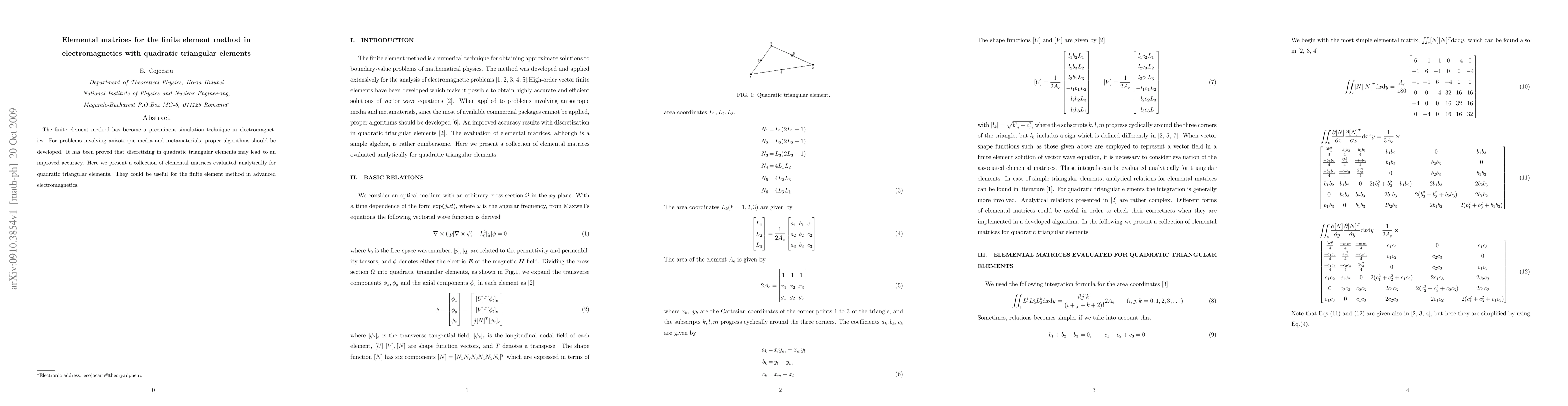 This paper presents analytically derived elemental matrices for the finite element method using quadratic triangular elements, aiming to improve accuracy in simulations involving anisotropic media and metamaterials in electromagnetics. These matrices are expected to enhance the precision of electromagnetic simulations.