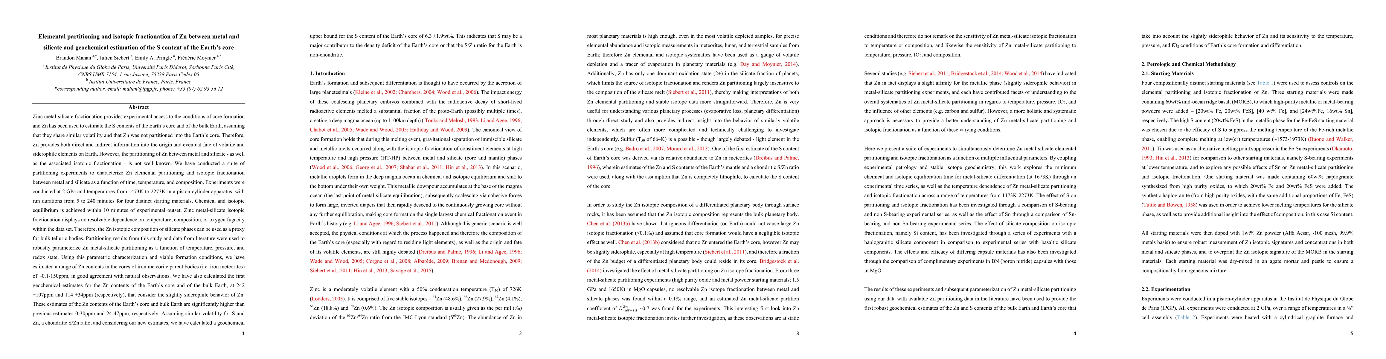 This paper investigates Zn metal-silicate partitioning and isotopic fractionation to estimate the S content of the Earth's core, finding Zn contents of 242 +/-107 ppm in the core and 114 +/-34 ppm in the bulk Earth, significantly higher than previous estimates. It suggests a geochemical upper bound for the Earth's core S content of 6.3 +/-1.9 wt%, indicating S's potential major contribution to the core's density deficit.