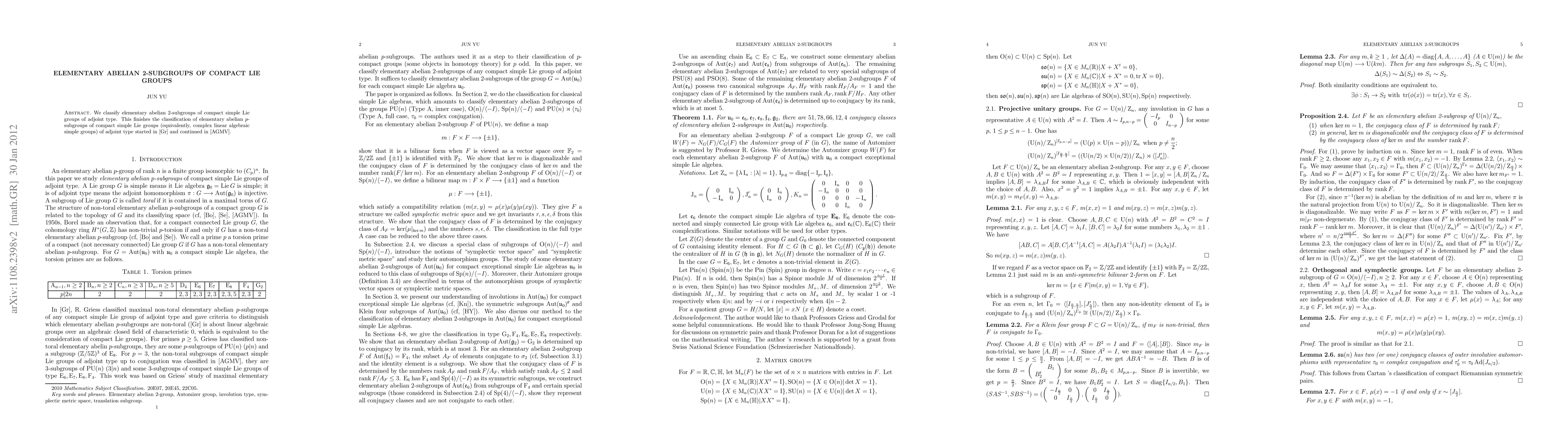 The paper classifies elementary abelian 2-subgroups within compact simple Lie groups of adjoint type, completing the classification of such $p$-subgroups for all primes in these groups. This classification provides a comprehensive understanding of their structure.