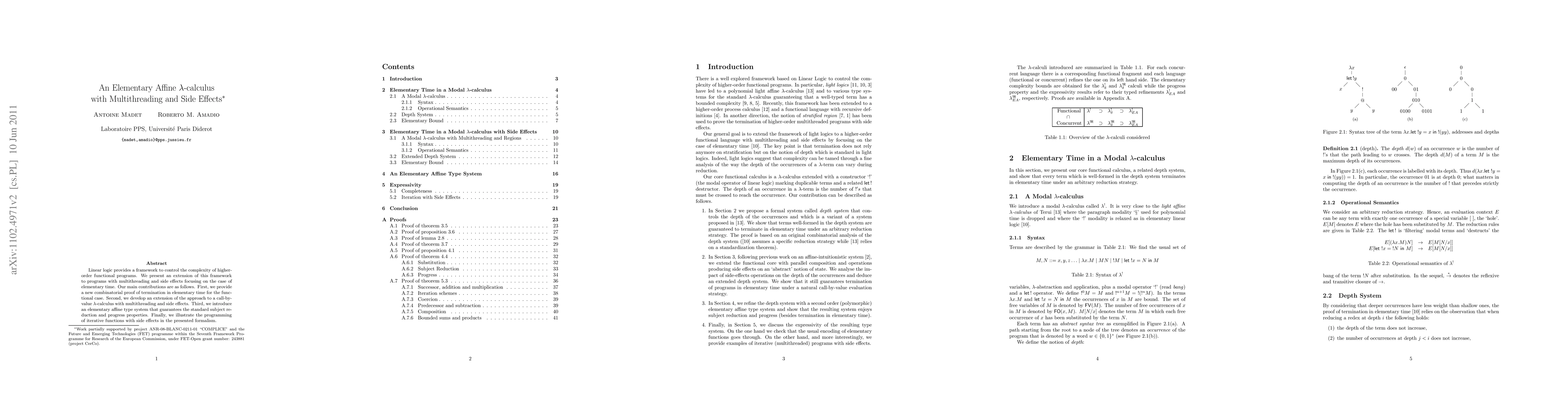 Linear logic provides a framework to control the complexity of higher-order functional programs. We present an extension of this framework to programs with multithreading and side effects focusing on the case of elementary time. Our main contributions are as follows. First, we provide a new combinatorial proof of termination in elementary time for the functional case. Second, we develop an extension of the approach to a call-by-value $lambda$-calculus with multithreading and side effects. Third, we introduce an elementary affine type system that guarantees the standard subject reduction and progress properties. Finally, we illustrate the programming of iterative functions with side effects in the presented formalism.