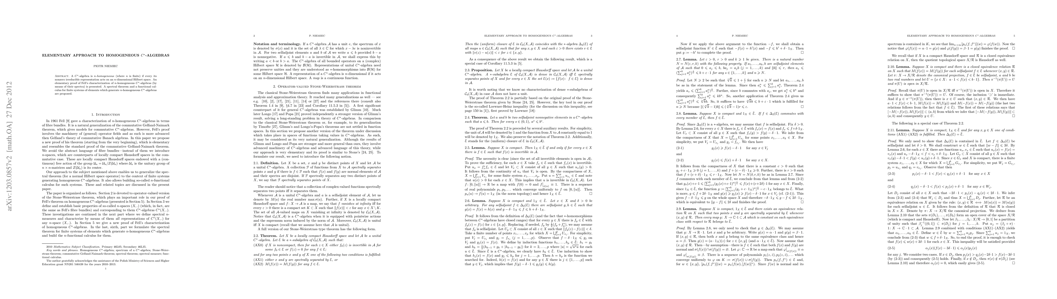 A C*-algebra is n-homogeneous (where n is finite) if every its nonzero irreducible representation acts on an n-dimensional Hilbert space. An elementary proof of Fell's characterization of n-homogeneous C*-algebras (by means of their spectra) is presented. A spectral theorem and a functional calculus for finite systems of elements which generate n-homogeneous C*-algebras are proposed.