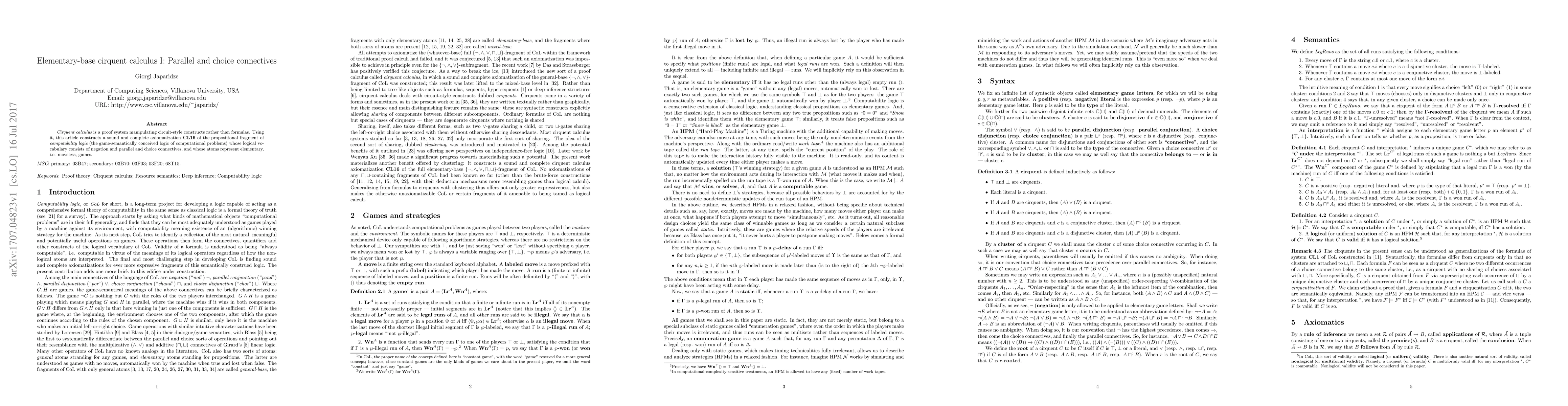 Cirquent calculus is a proof system manipulating circuit-style constructs rather than formulas. Using it, this article constructs a sound and complete axiomatization CL16 of the propositional fragment of computability logic (the game-semantically conceived logic of computational problems - see http://www.csc.villanova.edu/~japaridz/CL/ ) whose logical vocabulary consists of negation and parallel and choice connectives, and whose atoms represent elementary, i.e. moveless, games.