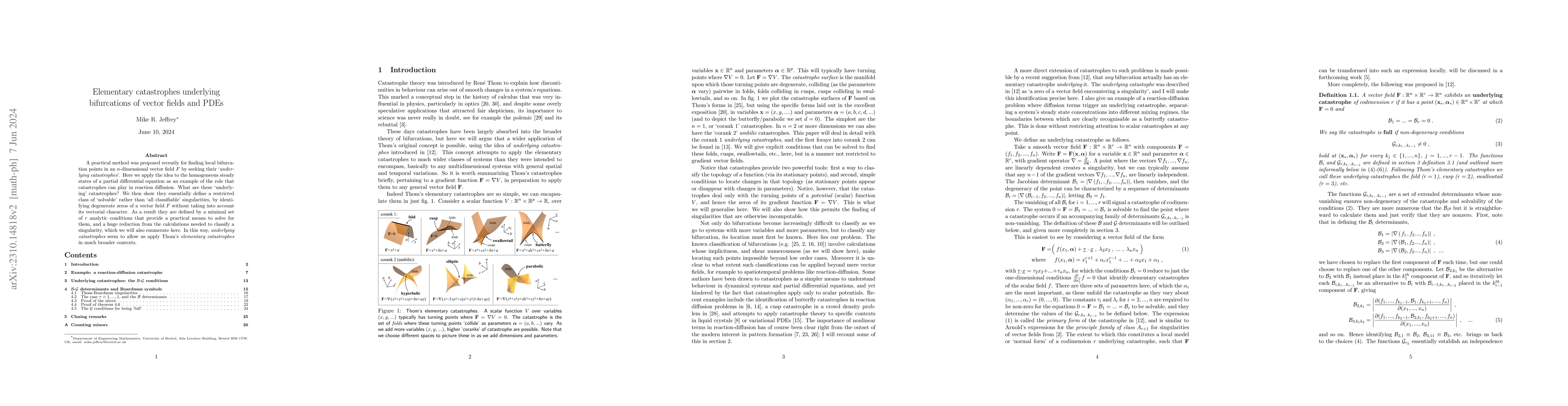 A practical method was proposed recently for finding local bifurcation points in an n-dimensional vector field F by seeking their 'underlying catastrophes'. Here we apply the idea to the homogeneous steady states of a partial differential equation as an example of the role that catastrophes can play in reaction diffusion. What are these 'underlying' catastrophes? We then show they essentially define a restricted class of 'solvable' rather than 'all classifiable' singularities, by identifying degenerate zeros of a vector field F without taking into account its vectorial character. As a result they are defined by a minimal set of r analytic conditions that provide a practical means to solve for them, and a huge reduction from the calculations needed to classify a singularity, which we will also enumerate here. In this way, underlying catastrophes seem to allow us apply Thom's elementary catastrophes in much broader contexts.