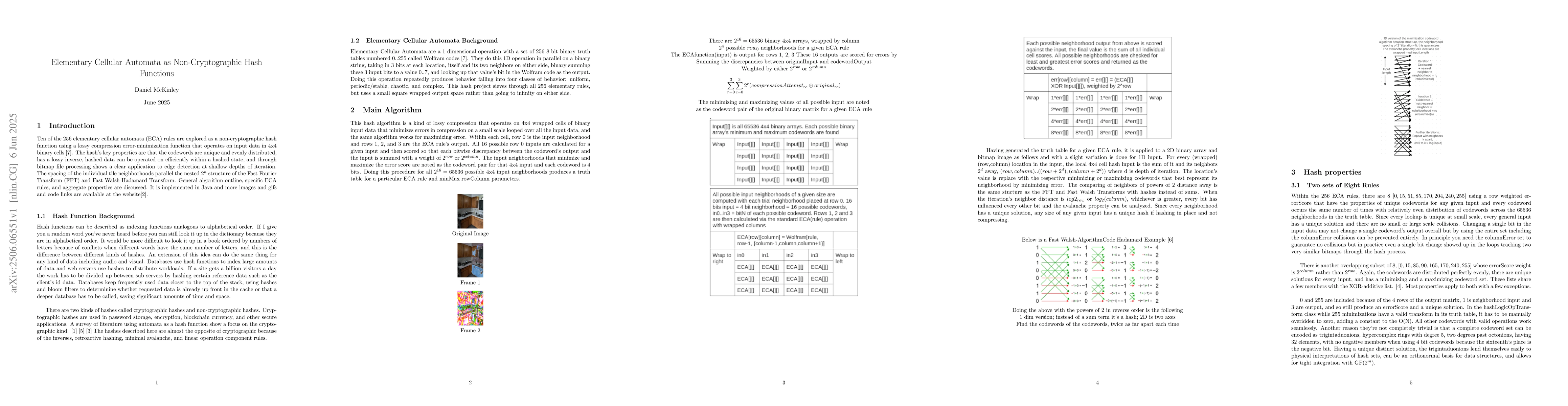 Researchers found 10 elementary cellular automata that can be used as hash functions with unique properties, including error minimization and maximization, and efficient retroactive hashing, offering potential for edge detection applications.