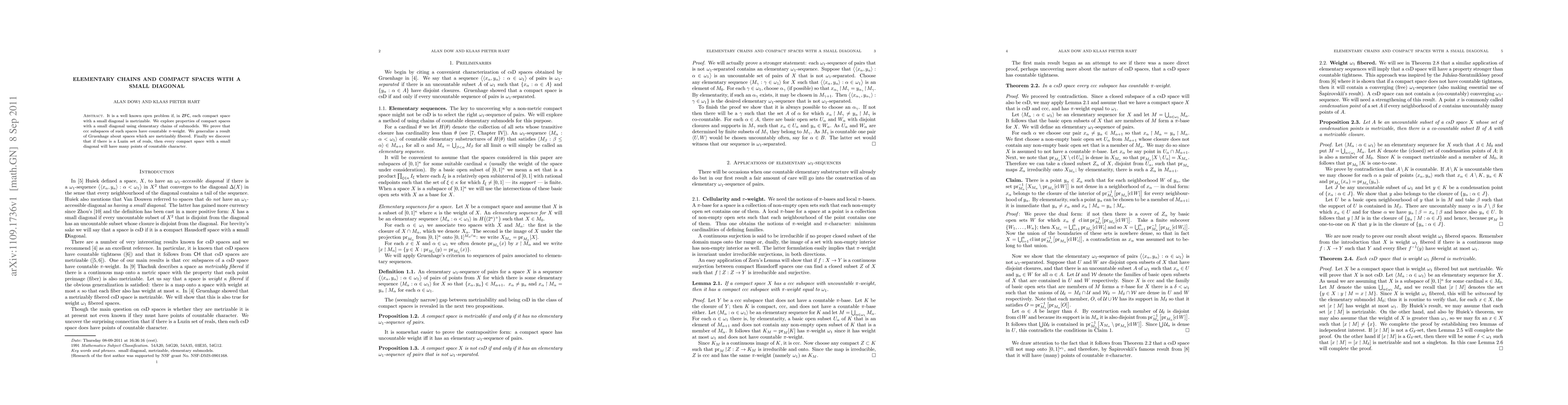 It is a well known open problem if, in ZFC, each compact space with a small diagonal is metrizable. We explore properties of compact spaces with a small diagonal using elementary chains of submodels. We prove that ccc subspaces of such spaces have countable \pi-weight. We generalize a result of Gruenhage about spaces which are metrizably fibered. Finally we discover that if there is a Luzin set of reals, then every compact space with a small diagonal will have many points of countable character.