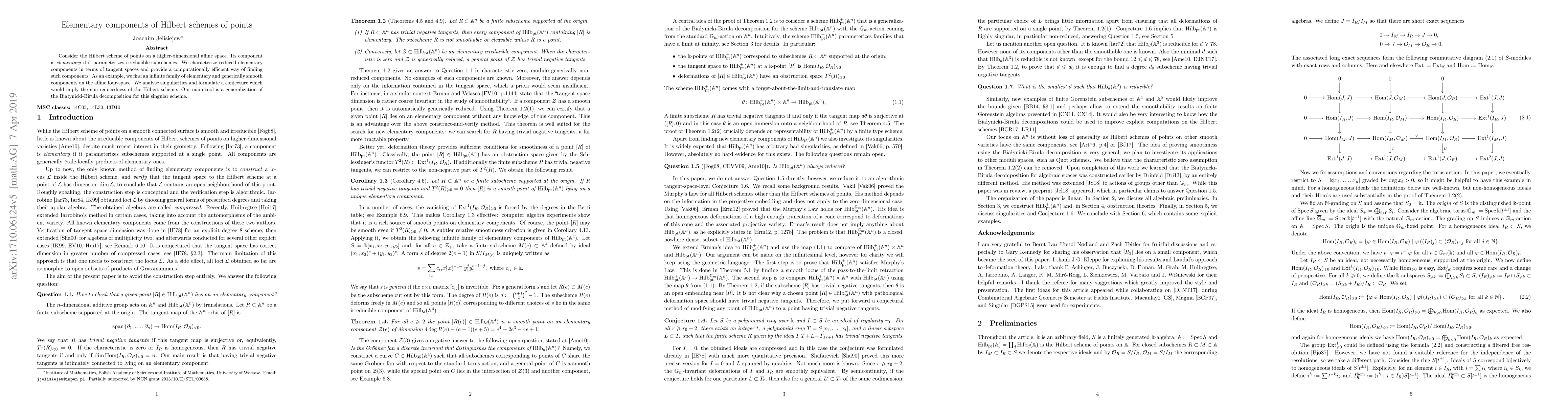 We generalize the Bialynicki-Birula decomposition to singular schemes and apply it to the Hilbert scheme of points on an affine space. We find an infinite family of small, elementary and generically smooth components of the Hilbert scheme of points of the affine four-space. Our method gives easily verifiable sufficient conditions for proving that a point of the Hilbert scheme is smooth and lies on an elementary component. We also present a necessary condition for smoothability of a finite subscheme given by a homogeneous ideal.