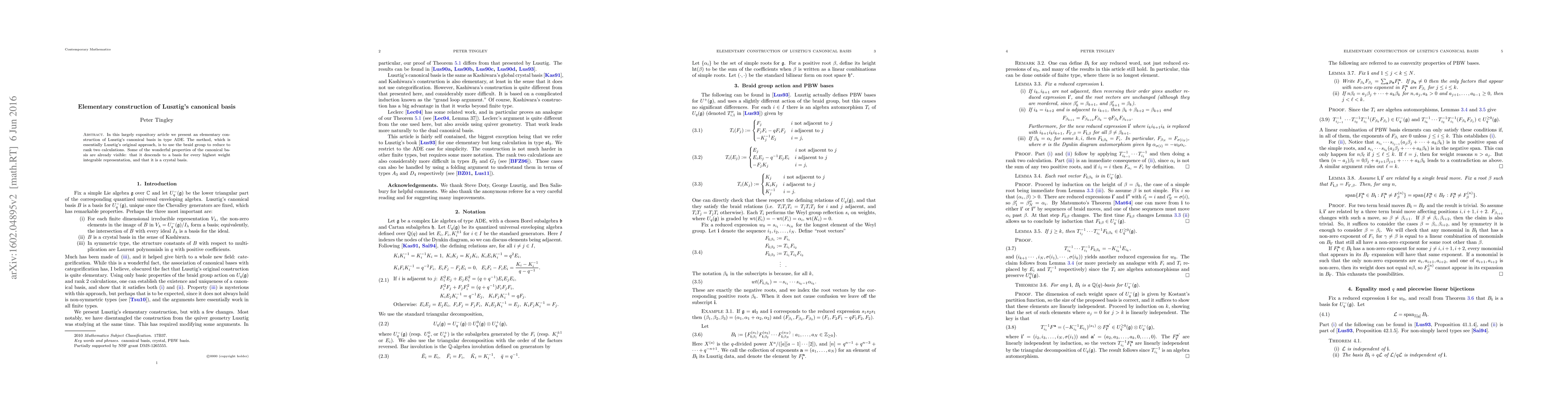 In this largely expository article we present an elementary construction of Lusztig's canonical basis in type ADE. The method, which is essentially Lusztig's original approach, is to use the braid group to reduce to rank two calculations. Some of the wonderful properties of the canonical basis are already visible; that it descends to a basis for every highest weight integrable representation, and that it is a crystal basis.