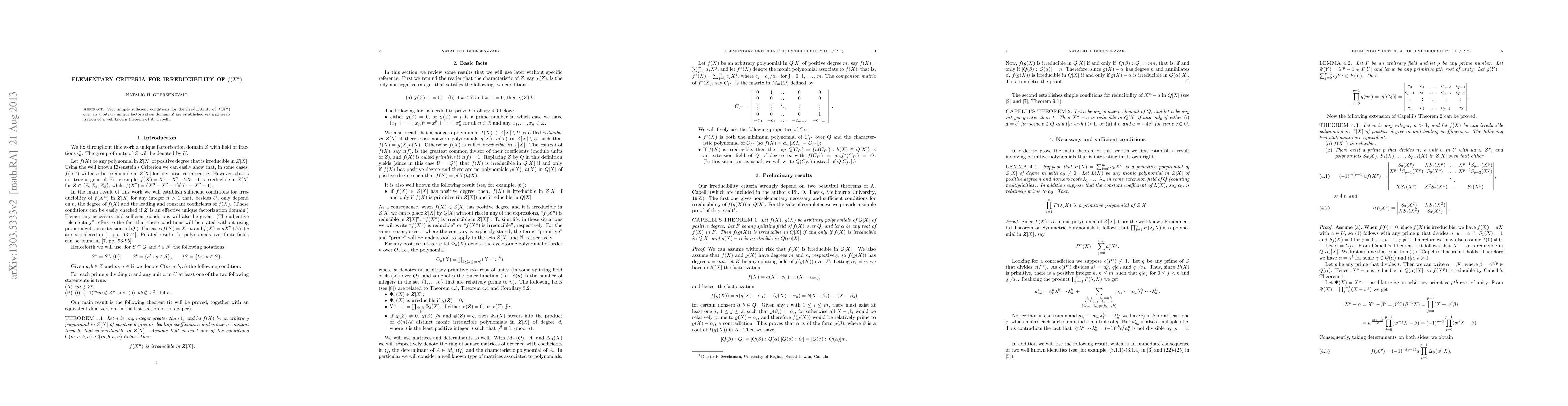 Summary: This paper establishes straightforward sufficient conditions for the irreducibility of $f(X^n)$ over any unique factorization domain $Z$, using a generalization of Capelli’s theorem. The criteria provide a simple method to determine irreducibility.