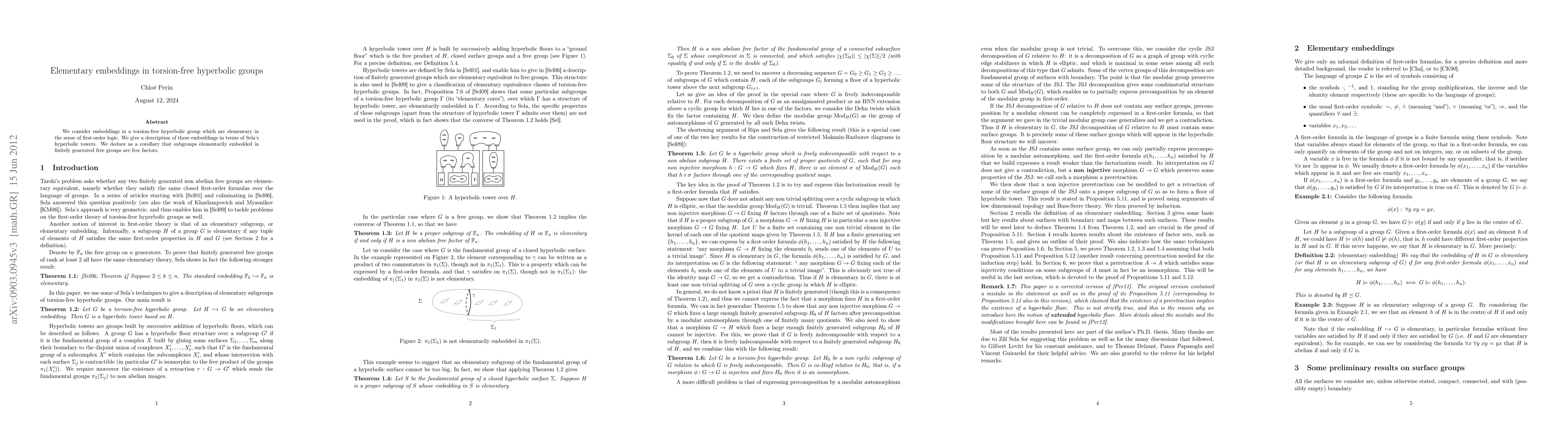 This paper explores elementary embeddings in torsion-free hyperbolic groups, characterized via Sela's hyperbolic towers, and concludes that subgroups elementarily embedded in finitely generated free groups are free factors.