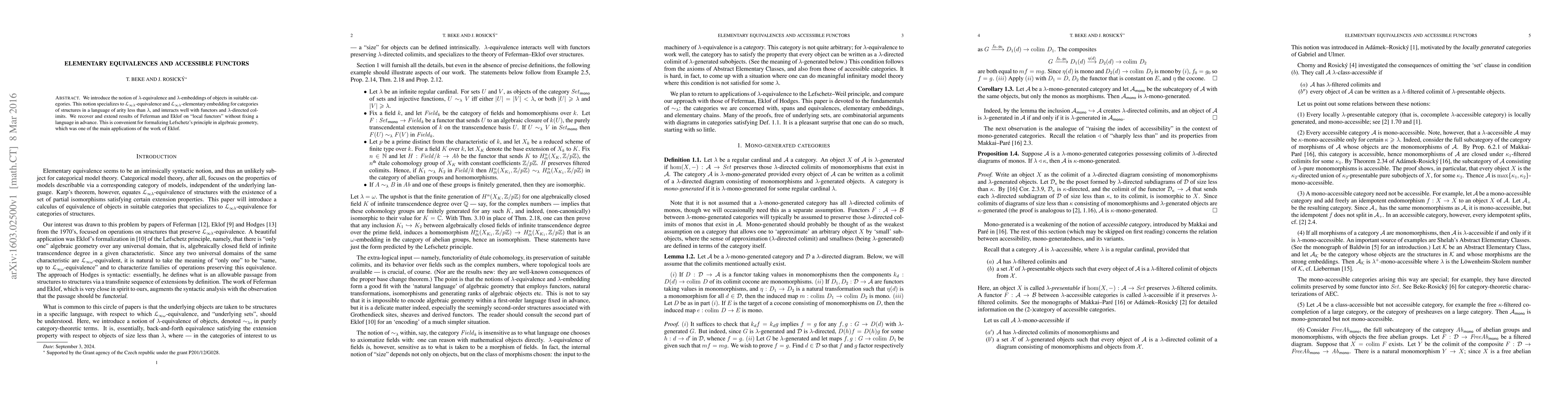 This paper introduces a new notion of equivalence and embedding for objects in suitable categories, allowing for flexible functors and interactions with colimits. It recovers and extends previous results on local functors, enabling applications like formalizing Lefschetz's principle in algebraic geometry.