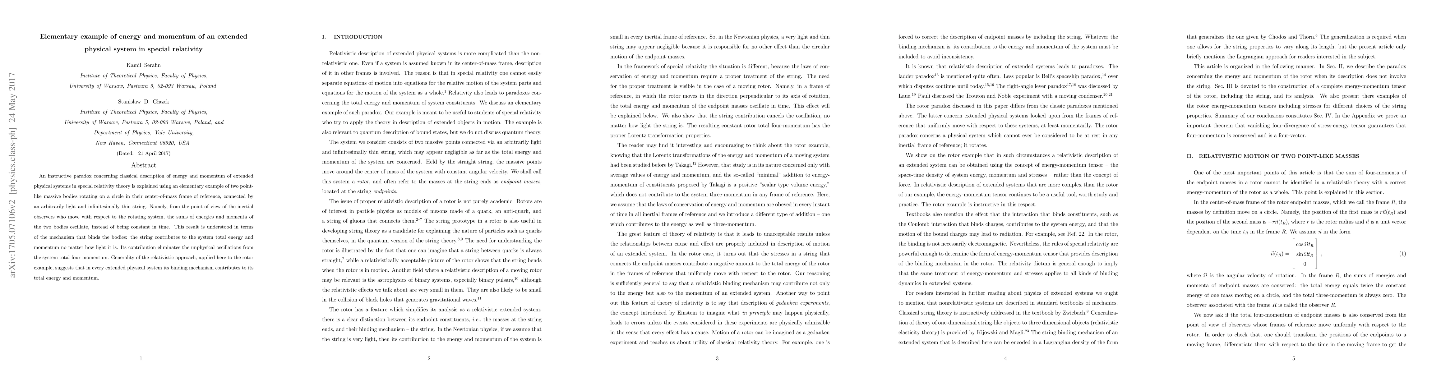 This paper explains a paradox in special relativity regarding the energy and momentum of rotating extended systems, using a simple example of two rotating masses connected by a string. It reveals that the total energy and momentum of the system oscillate from an external observer's perspective, but this oscillation is resolved by recognizing the string's contribution to the system's total energy and momentum.