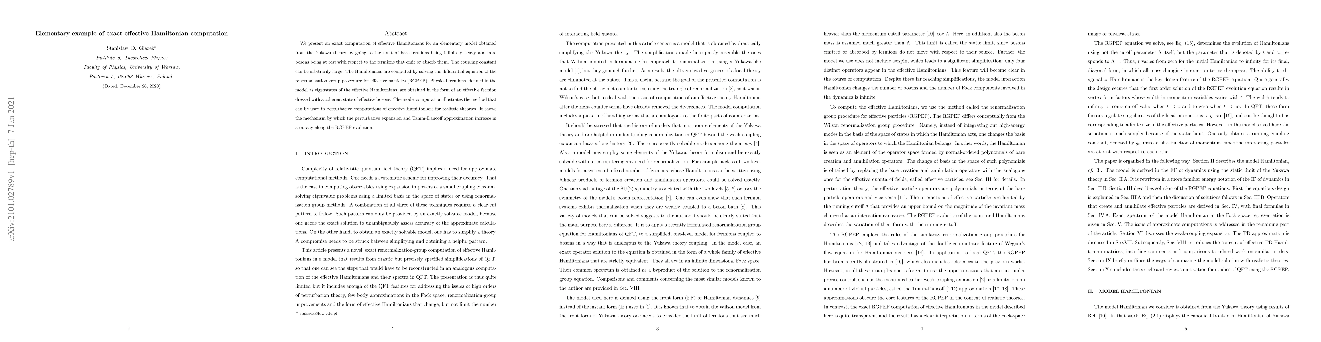 We present an exact computation of effective Hamiltonians for an elementary model obtained from the Yukawa theory by going to the limit of bare fermions being infinitely heavy and bare bosons being at rest with respect to the fermions that emit or absorb them. The coupling constant can be arbitrarily large. The Hamiltonians are computed by solving the differential equation of the renormalization group procedure for effective particles (RGPEP). Physical fermions, defined in the model as eigenstates of the effective Hamiltonians, are obtained in the form of an effective fermion dressed with a coherent state of effective bosons. The model computation illustrates the method that can be used in perturbative computations of effective Hamiltonians for realistic theories. It shows the mechanism by which the perturbative expansion and Tamm-Dancoff approximation increase in accuracy along the RGPEP evolution.