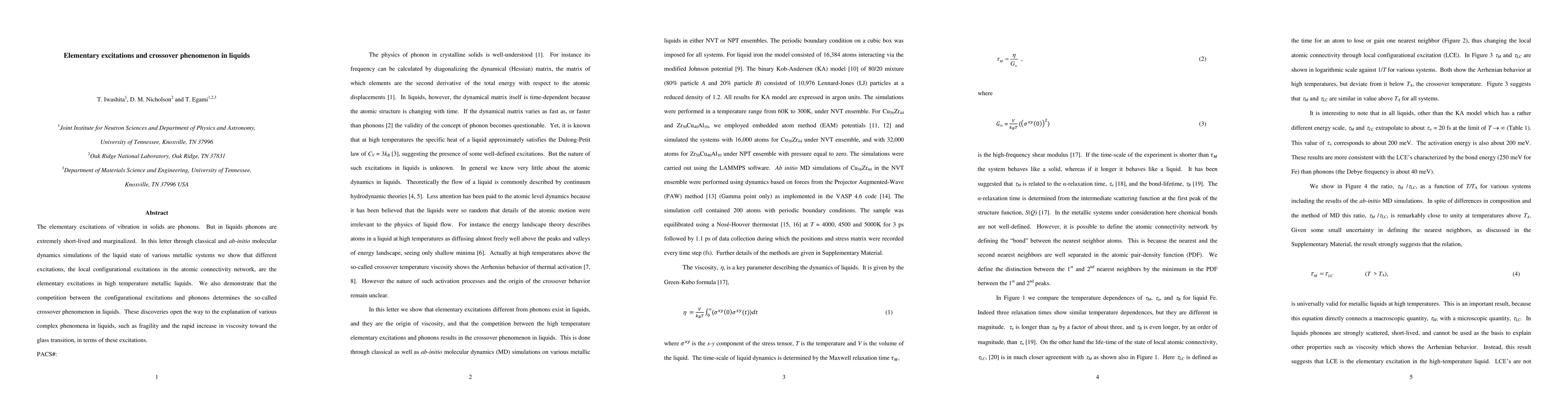 The elementary excitations of vibration in solids are phonons. But in liquids phonons are extremely short-lived and marginalized. In this letter through classical and ab-initio molecular dynamics simulations of the liquid state of various metallic systems we show that different excitations, the local configurational excitations in the atomic connectivity network, are the elementary excitations in high temperature metallic liquids. We also demonstrate that the competition between the configurational excitations and phonons determines the so-called crossover phenomenon in liquids. These discoveries open the way to the explanation of various complex phenomena in liquids, such as fragility and the rapid increase in viscosity toward the glass transition, in terms of these excitations.