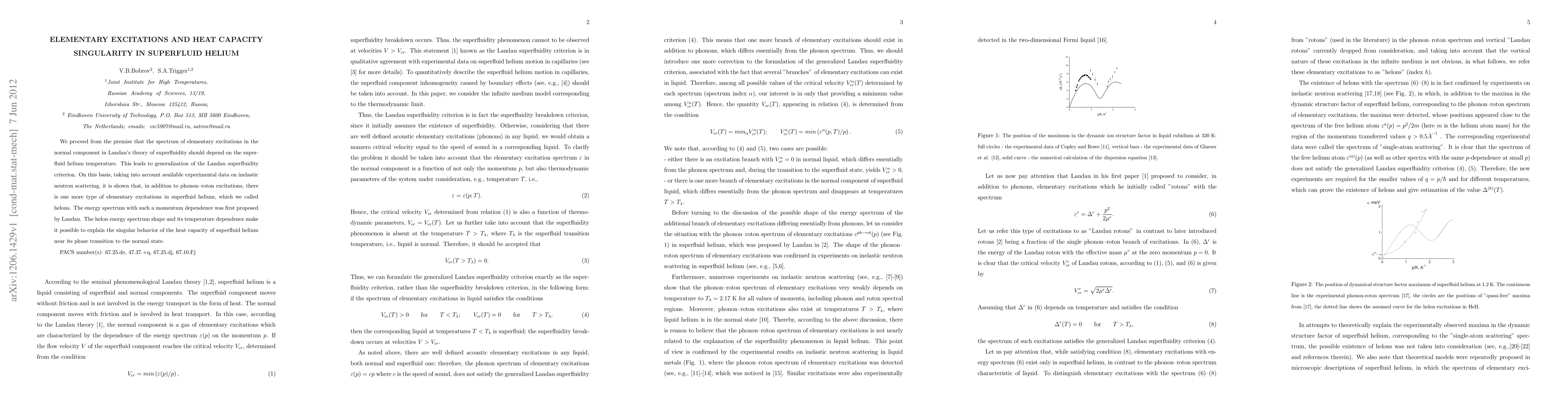 The paper introduces helons as a new type of elementary excitation in superfluid helium and demonstrates their role in explaining the heat capacity singularity near the phase transition.