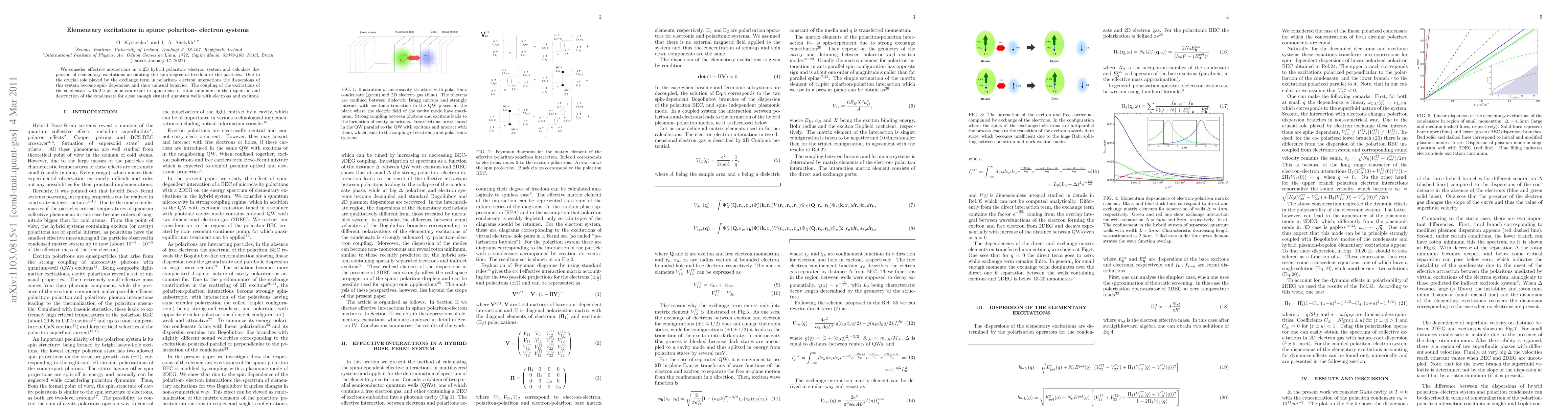This paper investigates the effective interactions in a 2D hybrid polariton-electron system, revealing spin-dependent dispersions due to the exchange term. The coupling with 2D plasmons may lead to a roton minimum and condensate destruction in closely situated quantum wells.