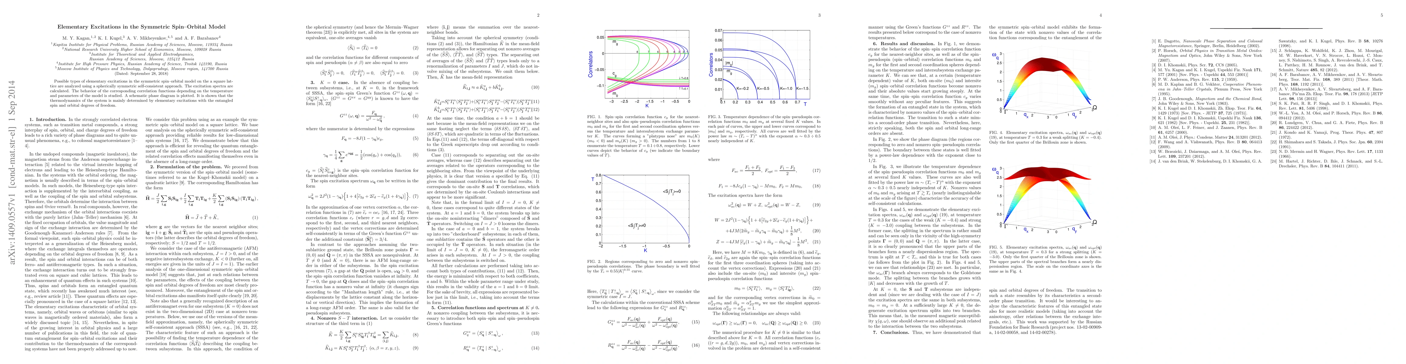 Possible types of elementary excitations in the symmetric spin-orbital model on the a square lattice are analyzed using a spherically symmetric self-consistent approach. The excitation spectra are calculated. The behavior of the corresponding correlation functions depending on the temperature and parameters of the model is studied. A schematic phase diagram is plotted. It is shown that the thermodynamics of the system is mainly determined by elementary excitations with the entangled spin and orbital degrees of freedom.