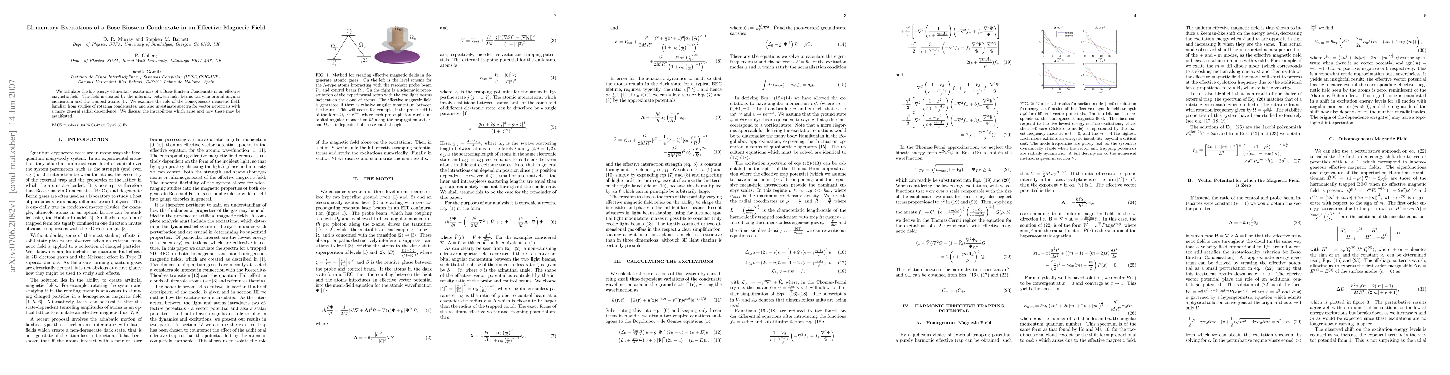 We calculate the low energy elementary excitations of a Bose-Einstein Condensate in an effective magnetic field. The field is created by the interplay between light beams carrying orbital angular momentum and the trapped atoms. We examine the role of the homogeneous magnetic field, familiar from studies of rotating condensates, and also investigate spectra for vector potentials with a more general radial dependence. We discuss the instabilities which arise and how these may be manifested.
