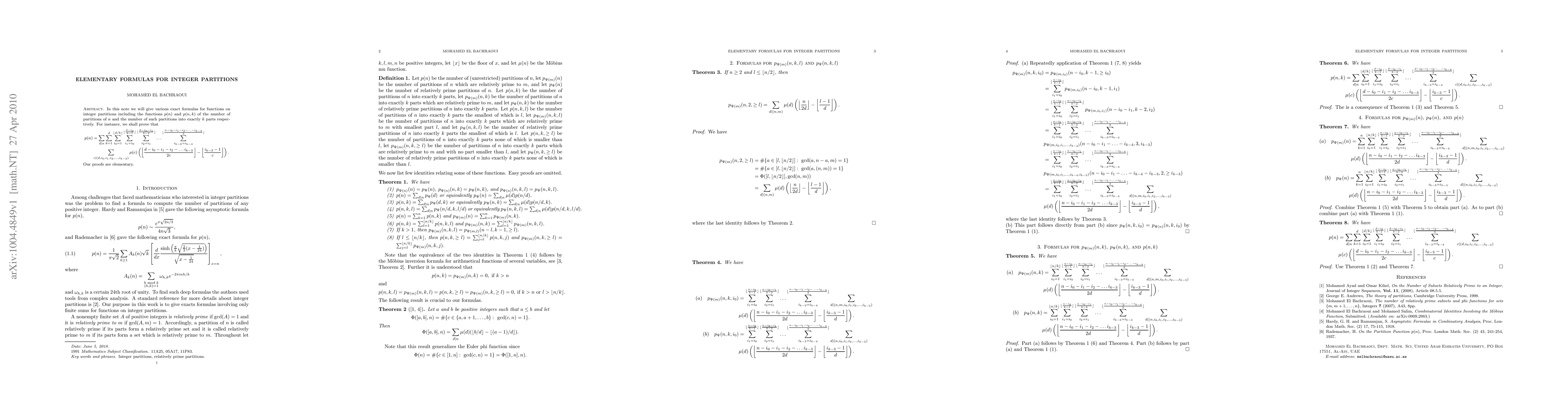 This paper provides exact formulas for integer partition functions, including $p(n)$ and $p(n,k)$, using elementary methods. It presents a complex summation formula for $p(n)$ involving divisors and Möbius function, demonstrating a detailed combinatorial approach.