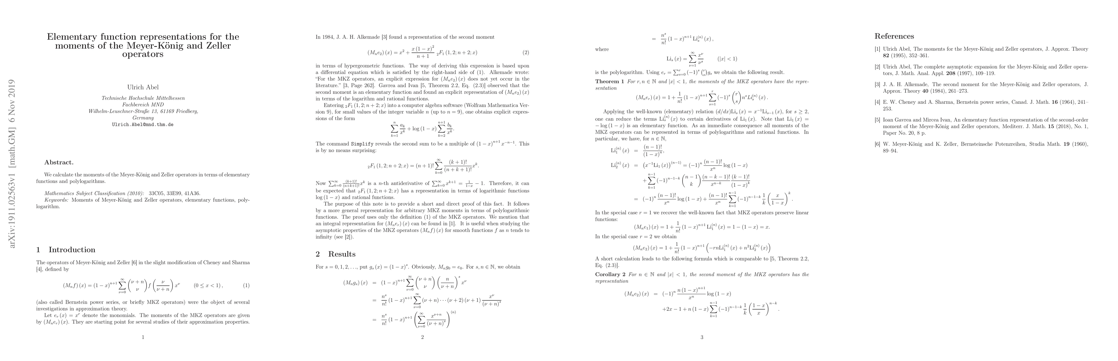 Summary: This paper determines the moments of the Meyer-König and Zeller operators using elementary functions and polylogarithms. It provides a mathematical representation for these moments in a simplified form.