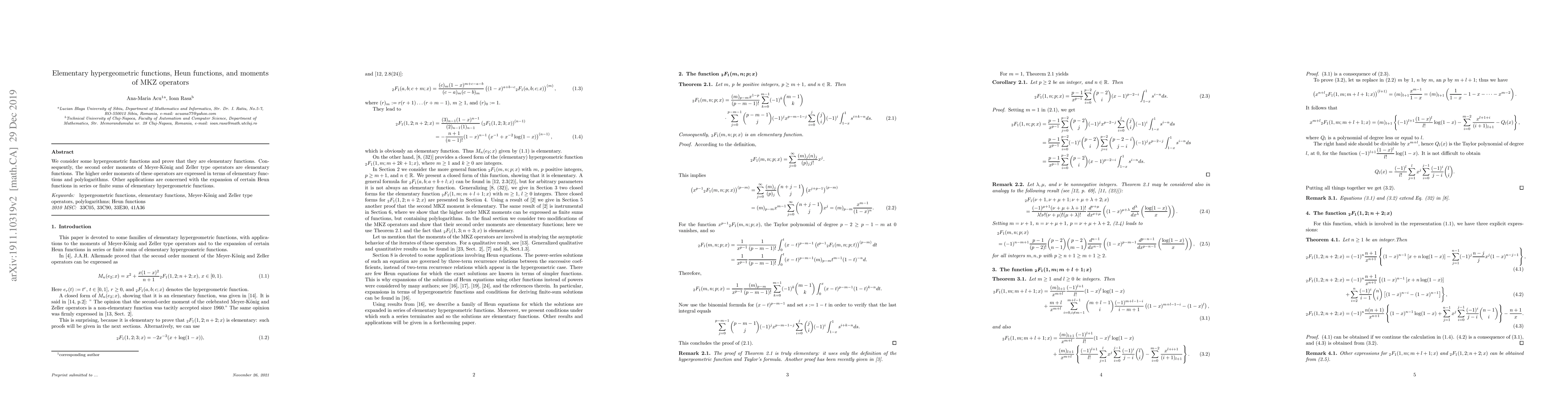 This paper demonstrates that certain hypergeometric functions are elementary and shows that the second-order moments of Meyer-Konig and Zeller operators are elementary functions. Higher-order moments are expressed in terms of elementary functions and polylogarithms, with additional applications involving the expansion of Heun functions in series or finite sums of elementary hypergeometric functions.