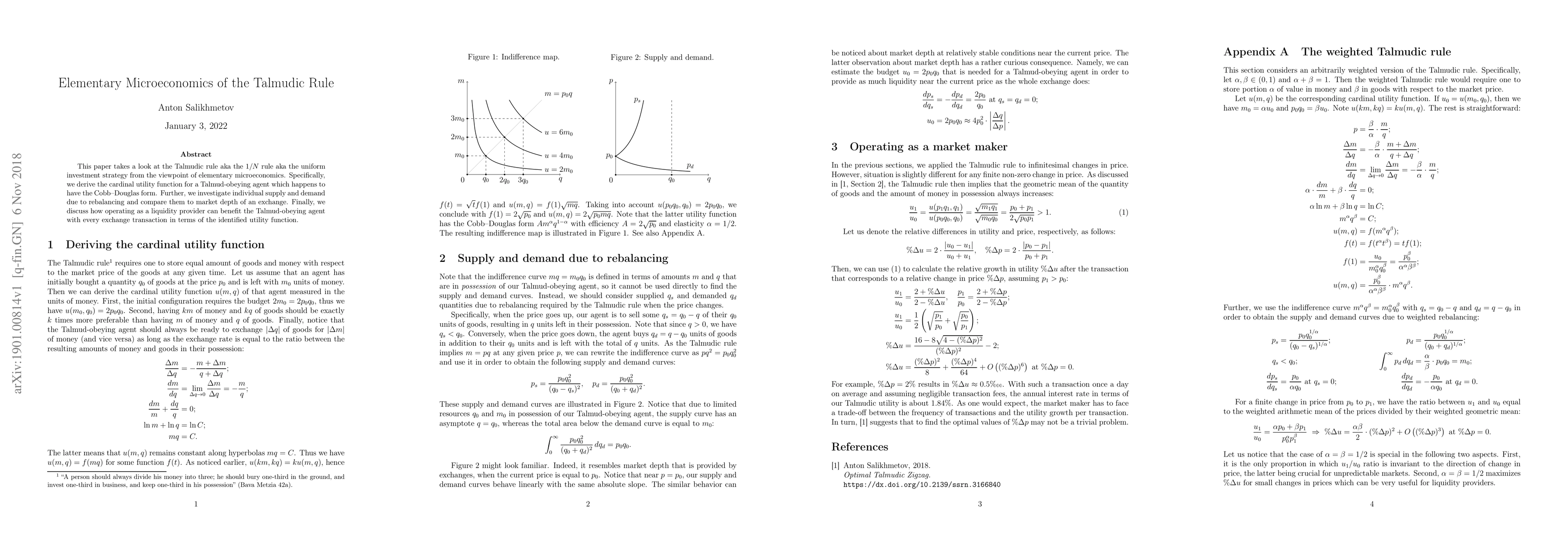 This paper takes a look at the Talmudic rule aka the 1/N rule aka the uniform investment strategy from the viewpoint of elementary microeconomics. Specifically, we derive the cardinal utility function for a Talmud-obeying agent which happens to have the Cobb-Douglas form. Further, we investigate individual supply and demand due to rebalancing and compare them to market depth of an exchange. Finally, we discuss how operating as a liquidity provider can benefit the Talmud-obeying agent with every exchange transaction in terms of the identified utility function.